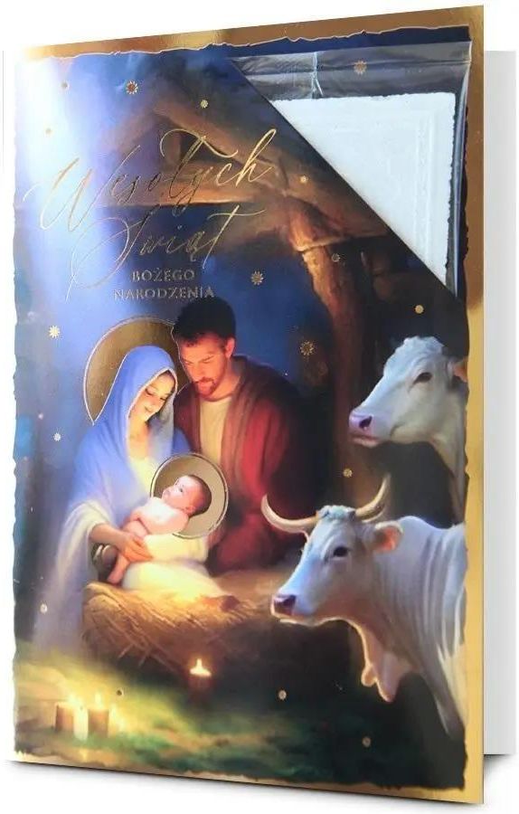 Świąteczna kartka z opłatkiem w zestawie.Kartka jest zdobiona złotą folią. W zestawie znajduje się koperta, kolorystycznie uzupełniająca się z kartką. Rozmiar złożonej kartki (szer x wys): 12 x 17 cm Producent/osoba odpowiedzialna za bezpieczeństwo produktuPan Dragon Sp. z o.o.Hallera 6/580-218 Gdańskadam@pandragon.com.pl604439977