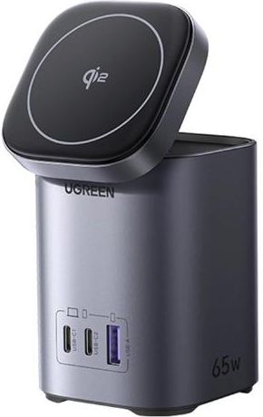 UGREEN Ładowarka Sieciowa 2w1 USB + 2x USB-C 65W GaN Ładowanie Magnetyczne UGREEN X555 to kompaktowe i wydajne rozwiązanie dla tych, którzy chcą szybko ładować do 4 urządzeń jednocześnie. Dzięki mocy 65W, technologii GaN oraz wbudowanej magnetycznej ładowarce Qi2 15W produkt zapewnia błyskawiczne odnawianie energii zarówno w smartfonach, jak i laptopach. Magnetyczna podstawka umożliwia regulację kąta nachylenia i pełny obrót o 360°, zwiększając wygodę użytkowania. Specyfikacja Producent: UGREEN Model: X555 Kod producenta: 55321 Moc wyjściowa: 65W Porty: 2x USB-C, 1x USB-A + funkcja ładowarki Qi2 15W Ładowanie bezprzewodowe: Qi2 15W (iPhone 12-16) Obsługiwane protokoły szybkiego ładowania: Samsung Super Fast 2.0 45W, PD 65W Kąt regulacji: 65° (składany), 360° (obrót) Kompatybilność: MacBook Pro/Air, Dell XPS, Chromebook, iPad Pro/Air/Mini, iPhone 8-16, Galaxy S10-S24, Pixel 2-9 Pro, słuchawki Bluetooth Zalety Maksymalna moc ładowania 65W: szybkie ładowanie laptopów, tabletów i smartfonów. 4 porty ładowania: 2x USB-C, 1x USB-A i ładowarka bezprzewodowa Qi2. Ładowarka bezprzewodowa Qi2 15W: certyfikowane szybkie ładowanie iPhone’ów (seria 12–16). Obsługa standardów szybkiego ładowania: PD 65W, Samsung Super Fast Charging 2.0 (45W). Technologia GaN (azotek galu): kompaktowa konstrukcja, niska emisja ciepła, wysoka efektywność. Magnetyczne mocowanie: silne magnesy N48*16 stabilnie utrzymują telefon w miejscu. Szybkie ładowanie 2 porty USB-C i jeden USB-A umożliwiają efektywne ładowanie laptopów, tabletów oraz telefonów z pełną mocą do 65W. Obsługa Samsung Super Fast 2.0 45W pozwala już w godzinę naładować Galaxy S24 Ultra, a kompatybilność z PD 65W sprawia, że MacBooki i inne ultrabooki ładują się równie szybko jak przy użyciu oryginalnych zasilaczy. Certyfikowane ładowanie Qi2 15W Magnetyczna ładowarka bezprzewodowa Qi2 gwarantuje pełną moc 15W dla iPhone’ów z serii 12-16, co oznacza szybsze i bardziej stabilne ładowanie niż w przypadku niecertyfikowanych rozwiązań. Silne magnesy N48*16 zapewniają pewne mocowanie telefonu, eliminując ryzyko przesunięcia podczas ładowania. Regulowana podstawka i tryb Standby Podstawka z możliwością regulacji nachylenia do 65° i pełnym obrotem 360° pozwala na wygodne korzystanie ze smartfona podczas ładowania. Możesz więc swobodnie oglądać filmy i prowadzić wideorozmowy. Umieszczony w poziomie iPhone automatycznie aktywuje tryb Standby, wyświetlając zegar i inne widżety systemowe. Bezpieczeństwo i szeroka kompatybilność Zastosowanie technologii GaN sprawia, że ładowarka pozostaje energooszczędna i nie przegrzewa się nawet przy maksymalnym obciążeniu. UGREEN X555 współpracuje z wieloma urządzeniami – od MacBooków i Chromebooków po smartfony Apple, Samsung i Google Pixel, a także słuchawki Bluetooth obsługujące standard Qi.
