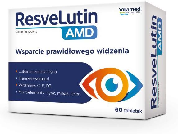 ResveLutin AMD - to suplement diety w formie tabletek, który w swoim składzie zawiera m.in. luteinę, zeaksantynę oraz trans-resweratrol. Produkt przeznaczony dla dorosłych. Bez glutenu. Odpowiedni dla diabetyków.