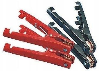 Zaciski do kabli rozruchowych 4 sztuki Komplet zacisków do kabli rozruchowych (krokodylki). Solidne, dobrze przewodzące zaciski do przewodów miedzianych, oznakowane: 2 czerwone, dwa czarne. Rączka z gumy izolującej; nasuwana – maskuje przyłączenie przewodu oraz dodatkowo poprawia komfort użytkowania. Montowanie kabla na zacisk osadzony wewnątrz rączki. Możliwość zastosowania grubych, a nawet bardzo grubych przewodów. Rozmiar: długość całego zacisku: 15 cm długość rączki (izolacji): 6 cm ZACISKI DO KABLI ROZRUCHOWYCH 'JUMBO' 4 szt. 'JUMBO' - Komplet dużych zacisków do kabli rozruchowych (krokodylki). Solidne, dobrze przewodzące zaciski do przewodów miedzianych, oznakowane: 2 czerwone, dwa czarne. Zaciski typu krokodyl, w stalowej oprawie malowanej farbą nierdzewną. Posiadają wewnętrzne dociski stabilnie przytrzymujące kabel wewnątrz rączki. Montowanie kabla na zaciskach wewnątrz rączki. Możliwość zastosowania grubych, a nawet bardzo grubych przewodów. Rozmiary: - długość całego zacisku: 17 cm