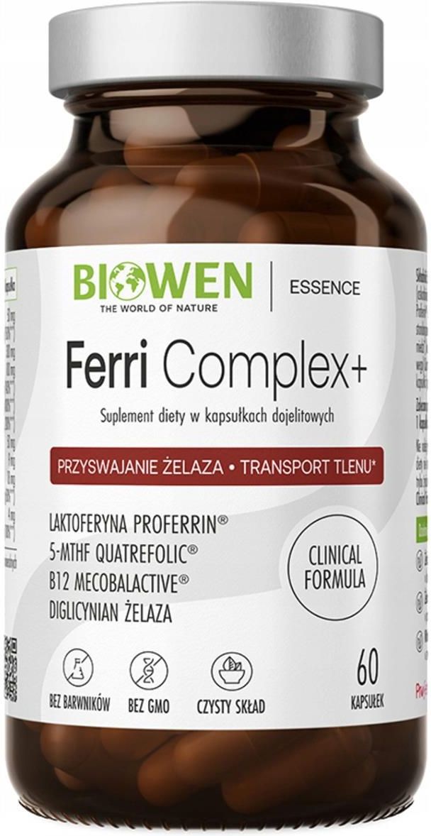 Kompleksowe wsparcie wchłanialności żelaza, poziomu ferrytyny i krwiotwórstwa; zawiera diglicynian żelaza, laktoferynę, witaminy, minerały i standaryzowane ekstrakty roślinne, które wspierają utrzymanie prawidłowej gospodarki żelazowej; naturalny, dobrze przebadany i czysty skład; odpowiedni nawet dla kobiet w ciąży i karmiących piersią oraz osób z mutacją MTHFR lub zaburzeniami metylacji; zawiera wysokiej jakości laktoferynę (96% Proferrin®), która poprawia wchłanianie żelaza i jest bezpieczna nawet osób z dolegliwościami jelitowymi (np. IBD, IBS); kapsułka o spowolnionym działaniu DR (Delayed Release) - uwalnia składniki dopiero w jelicie cienkim, chroniąc je przed działaniem soku żołądkowego i zwiększając ich stabilność opakowanie zawiera 60 kapsułek. Masa netto: 45,9 g Ferri Complex+ Biowen - co to? Jeśli chcesz rozszerzyć swoją dietę o żelazo, suplement w kapsułkach Ferri Complex+ od Biowen zasługuje na Twoją uwagę! Żelazo to pierwiastek niezbędny dla prawidłowego funkcjonowania organizmu człowieka – żelazo odgrywa kluczową rolę w tworzeniu hemoglobiny i procesie, jakim jest transport tlenu. W składzie preparatu znajdziesz nie tylko dobrze przyswajalny diglicynian żelaza, lecz również inne składniki wspierające wchłanianie tego minerału i korzystnie wpływające na krwiotwórstwo. Naturalne ekstrakty roślinne, m.in. z buraka,, dopełniają takie składniki, jak witamina C, miedź, kwas foliowy, laktoferyna i witamina B12. Każdy z nich odgrywa istotną rolę w procesach wchłaniania, transportowania i wykorzystania żelaza w organizmie. Suplementacja żelaza w tej formie pomaga również szybciej uzupełnić żelazo w organizmie i zapobiegać takim problemom jak niedokrwistość z niedoboru żelaza czy objawy niedoboru żelaza. Zastosowane wspólnie działają synergicznie, wzmacniając swoje działanie i korzyści płynące z suplementacji. Dlaczego warto wybrać żelazo (suplement) od Biowen? Co wyróżnia żelazo bez recepty Biowen od innych suplementów dostępnych na rynku? Czysty, dobrze przebadany i naturalny skład - w preparacie Biowen nie znajdziesz szkodliwych substancji konserwujących, chemicznych antyzbrylaczy czy barwników; Kapsułki DR (Delayed Release) - czyli roślinna kapsułka dojelitowa o zwiększonej stabilności. Dzięki zastosowaniu tej innowacyjnej technologii składniki preparatu uwalniane są dopiero w jelicie cienkim. W ten sposób chronisz nie tylko wrażliwy żołądek, lecz także składniki aktywne przed działaniem soku żołądkowego; standaryzacja ekstraktów roślinnych - czyli wskaźnik zawartości substancji czynnej określający minimalną zawartość związków aktywnych w preparacie. Standaryzacja przekłada się na stałą jakość i działanie preparatu, dając Ci pewność, że każda kapsułka dostarcza deklarowanej na opakowaniu ilości danej substancji; bogaty i dobrze przemyślany skład kompleksowo wspiera wchłanialność żelaza i krwiotwórstwo; wysoka przyswajalność - zastanawiasz się, jakie żelazo najlepiej się wchłania? Zastosowany przez nas diglicynian żelaza to chelatowana forma tego minerału, która zapewnia lepsze wchłanianie. Dla zmaksymalizowania efektów preparat wzbogaciliśmy witaminą C, która znacząco wpływa na przyswajalność żelaza oraz laktoferyną. Jeśli interesuje Cię dobre żelazo bez recepty, ten produkt jest dla Ciebie! Ferrytyna a żelazo - czy wiesz, na czym polega różnica? Chociaż wiele osób używa tych nazw zamiennie, ferrytyna i żelazo to wcale nie to samo! Dlatego, aby łatwiej było Ci zrozumieć dalszą część tekstu, rozwiewamy wątpliwości. Żelazo to mikroelement wykorzystywany do tworzenia hemoglobiny, mioglobiny i wielu enzymów. Część żelaza krąży w naszej krwi, jako tzw. żelazo w surowicy, a kolejna jego część jest magazynowana. Badanie żelaza pokazuje nam, ile żelaza krąży aktualnie we krwi, nie mówiąc jednak nic o jego zapasach. I tutaj do akcji wkracza ferrytyna! Co to jest? Najprościej mówiąc, to białko magazynujące żelazo w śledzionie, wątrobie, mięśniach czy szpiku. Działa jak magazyn na żelazo, który w razie potrzeby może je uwolnić. I tak oto można mieć prawidłowy poziom żelaza, lecz niski poziom ferrytyny - taka sytuacja bywa wczesnym sygnałem niedoboru tego pierwiastka. Producent/ Podmiot odpowiedzialny Biodio Lab Sp. z o.o. Ul. Choroszczańska 24 15-732 Białystok