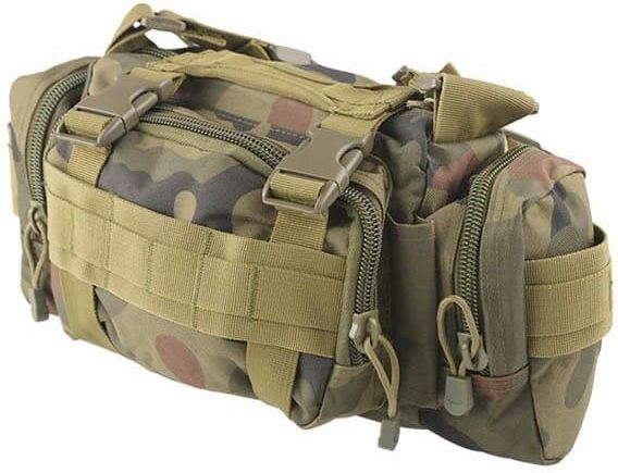 Torba wykonana z włókna nylonowego. Dzięki dużej ilości przegród oraz kieszeni możliwe jest przenoszenie wielu narzędzi oraz drobnych akcesoriów. Torbę można zamontować na palsy zgodne ze standardem Molle, na pas biodrowy oraz nosić ją na ramieniu. Główna kieszeń o wymiarach 215x80x170 mm posiada wewnątrz płaską kieszeń. Zewnętrzna kieszeń znajdująca się na froncie torby, o wymiarach 195x115x45 mm również zaopatrzona jest w płaskie przegrody umożliwiające przechowywanie w nich dokumentów lub innych płaskich rzeczy takich jak np. plaster opatrunkowy. Boczne kieszonki o wymiarach 55x75x125 mm posiadają zewnętrzne pasy umożliwiające zamontowanie dodatkowych ładownic. Wszystkie przegrody zapinane są za pomocą zamka błyskawicznego. Tylna część torby zaopatrzona jest w płaską przegrodę na zapinaną za pomocą rzepów. Dane techniczne: Materiał: Nylon Waga: 500 g Kolor: wz93 Pantera Leśna Wymiary: 170x320x80 mm