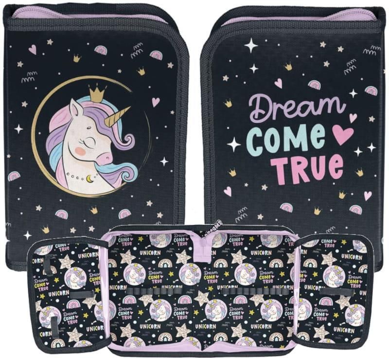{col/50/} PASO Piórnik jednokomorowy z klapkami BEZ WYPOSAŻENIA Wzór: Unicorn Kolor: czarno-różowy Wymiary: 19,5 x 13 x 3,5 cm Materiał: Poliester Piórnik nie zawiera wyposażenia! {col/50/} {col/50/} {col/50/} Idealny do szkoły i nie tylko! Przedstawiamy niezastąpiony piórnik marki PASO, który …