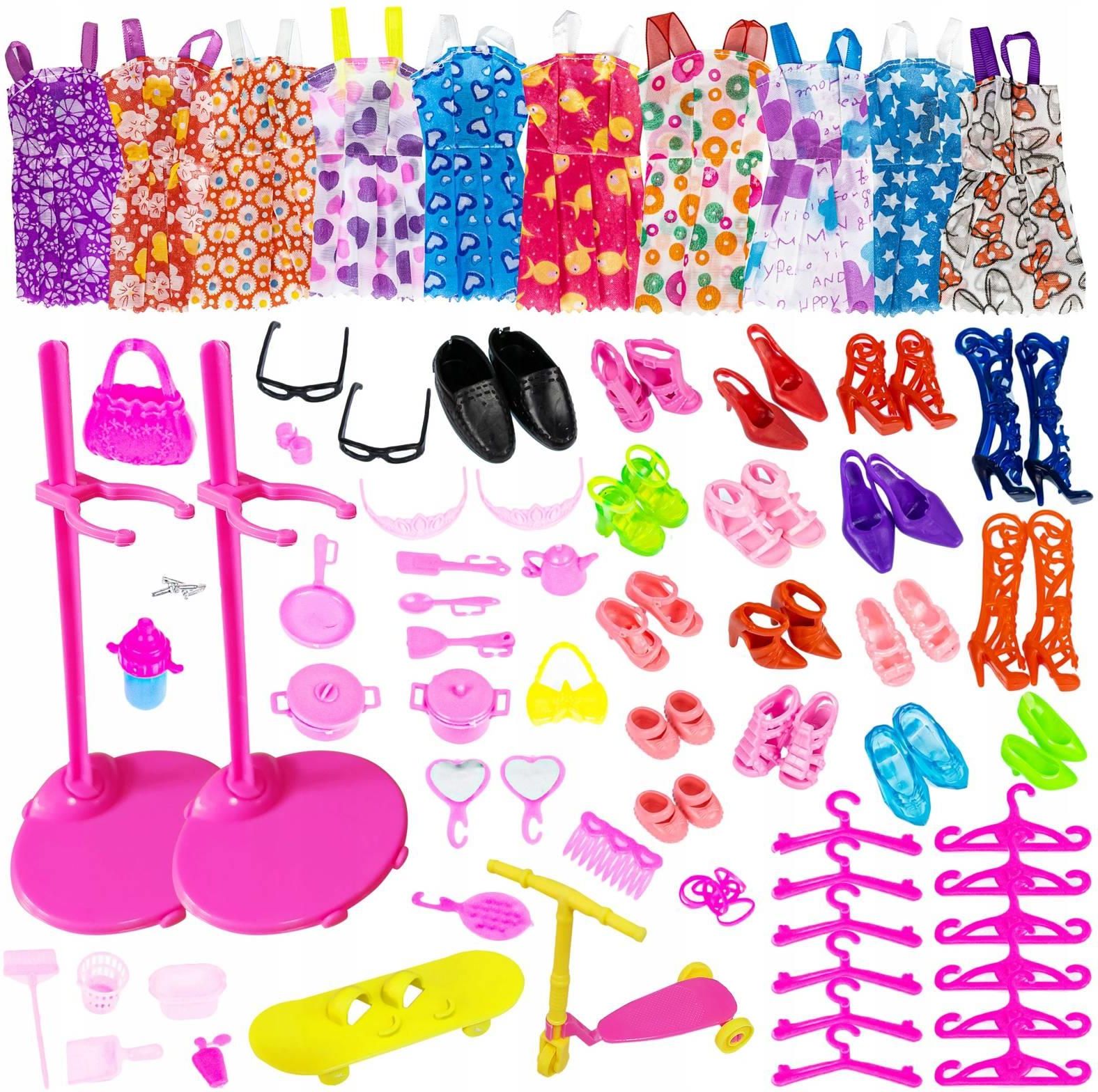 DUŻY ZESTAW DLA LALEK – UBRANKA + AKCESORIA! Kolorowy zestaw ubranek z akcesoriami dla lalek to idealny prezent dla każdej dziewczynki lubiącej bawić się w wizażystkę czy dom! UWAGA! LALKA WIDOCZNA NA ZDJĘCIU NIE JEST PRZEDMIOTEM AUKCJI Zestaw zawiera wszystkie niezbędne elementy do stylizacji lalki od ubrań po fryzurę. Taki prezent to marzenie wszystkich dziewczynek :) Ubranka dla lalek pozwolą na zabawę w projektanta mody, stworzenie wybiegu dla modelek czy przygotowanie sesji zdjęciowej. W zestawie znajdziesz między innymi Kolorowe sukienki o rożnych wzorach Dodatki: buty, torebki, biżuteria itp. Akcesoria: wieszaki, stojaki, przyrządy do sprzątania itp. Akcesoria do włosów: szczotki, gumki itp. Pojazdy typu deskorolka, hulajnoga Elementy zestawu posiadają uniwersalny rozmiar pasujący do niemal wszystkich lalek typu Barbie. Ogromna ilość dodatków oraz sukienek pozwoli na stworzenie mnóstwa różnych stylizacji. Z takim wyborem akcesoriów Twoje dziecko szybko się nie znudzi. Zestaw pobudza kreatywność, zdolność myślenia oraz wspomaga rozwój motoryki. Dziecko nauczy się cierpliwości oraz dbania o wygląd. Wyćwiczy zdolności poznawczo estetyczne podczas dobierania pasujących do siebie elementów. Może kiedyś zostanie prawdziwym projektantem mody ;) Wszystkie elementy wykonane są z wysokiej jakości materiałów, aby mogły jak najdłużej służyć Twojemu dziecku w zabawie. Sukienki zapinane są na rzep, aby ułatwić ubieranie lalki. Kolory oraz wzory elementów mogą się różnić od tych ze zdjęcia podglądowego. Dobierane są losowo. Zestaw zawiera małe elementy, nie jest wskazany dla dzieci poniżej 3 roku życia.
