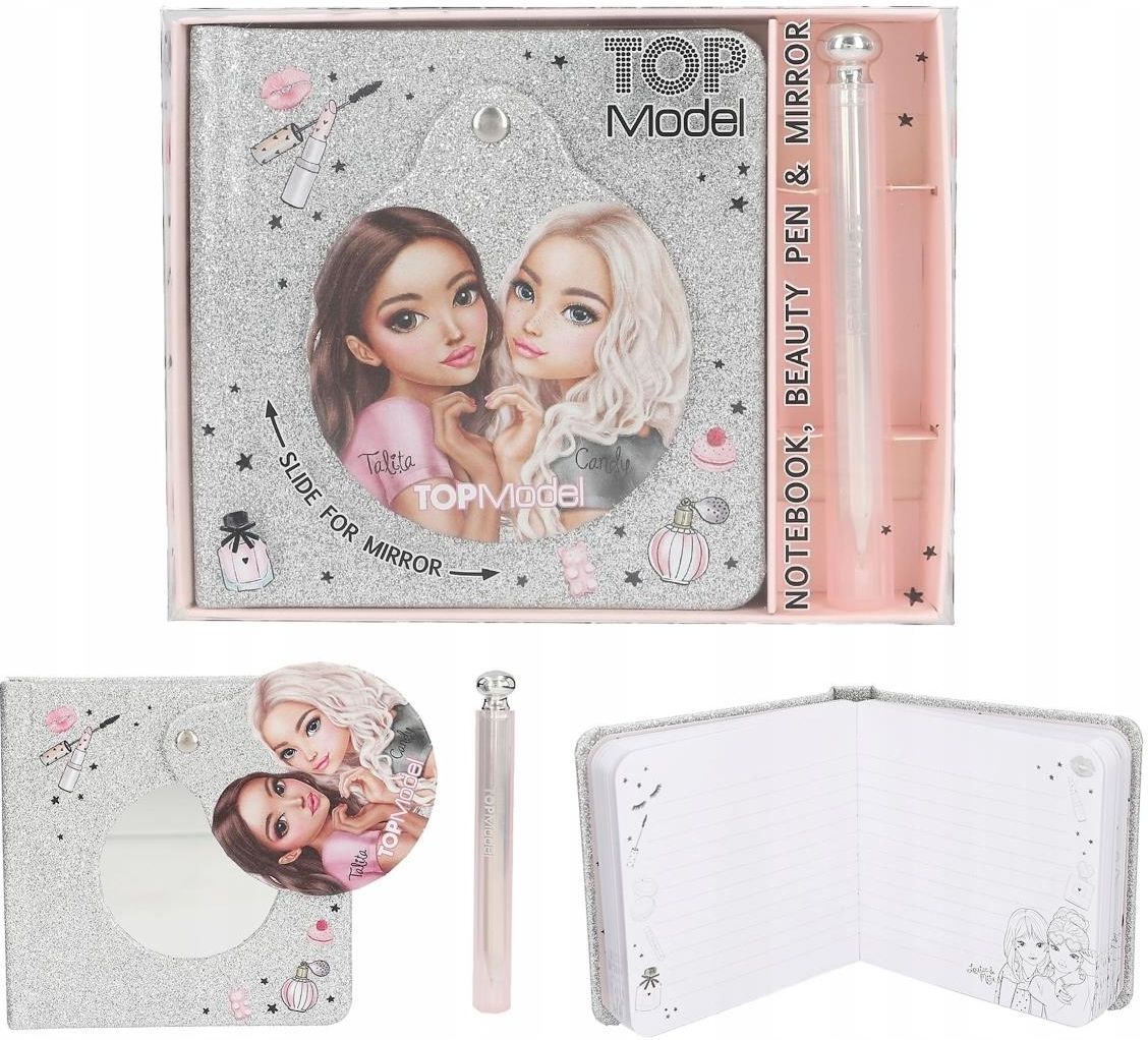 TOPMODEL Notes + długopis Pamiętnik z lusterkiem i długopisem Błysk, styl i funkcjonalność w jednym! Efektowna okładka: srebrna brokatowa powierzchnia z motywami beauty i uroczym wizerunkiem modelki przyciąga spojrzenia i dodaje elegancji. Tajemnicze lusterko w środku: wygodne, stylowe rozwiązanie …
