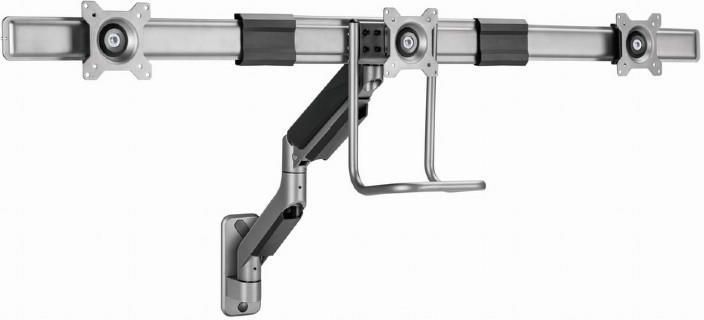 Naścienne ramię na 3 monitory (regulowane), od 17" do 27", obciążenie do 6kg Uchwyt do monitora GEMBIRD MA-WA3-01 w kolorze czarnym przeznaczony jest dla monitorów o rozmiarach ekranu 17 - 27 cali. Produkt zaprojektowany został jako uchwyt ścienny z pojedynczym ramieniem dla 3 monitorów. Montowany jest bezpośrednio do biurka. Ramiona umożliwiają obracanie, wydłużanie, chowanie lub pochylanie wyświetlacza. MA-WA3-01 posiada wytrzymały, mocny uchwyt ścienny do łatwego i bezpiecznego montażu, a także oferuje wbudowane zarządzanie kablami dla zorganizowanego i uporządkowanego miejsca pracy. Ponadto jest kompatybilny z VESA (100 x 100 mm i 75 x 75 mm). Poznaj uchwyt biurowy bliżej Uchwyt biurkowy do monitora z pojedynczym ramieniem dla 3 monitorów Ramię obraca się, wysuwa i chowa, przechyla się, aby zmienić kąt czytania Listwa montażowa monitora do montażu obok siebie 3 monitorów Umożliwia łatwe ergonomiczne ustawienie w celu zmniejszenia obciążenia Działa z prawie każdym monitorem LCD (maks. 27") Trwałe regulowane sprężyny gazowe odpowiednie dla monitorów o wadze 1 - 6 kg Mocny uchwyt ścienny do prostego montażu Wbudowane zarządzanie kablami dla zorganizowanego i uporządkowanego miejsca pracy Zgodność ze standardem VESA (100 x 100 mm i 75 x 75 mm) Ramię do 3 monitorów, jest regulowane w zakresie od 17 do 32 cali i może pomieścić do 6 kg. To oznacza, że jest w stanie pomieścić większość monitorów dostępnych na rynku. Regulacja pozwala dostosować pozycję monitora do potrzeb użytkownika, co wpłynie na poprawę komfortu pracy. Biurkowe ramiona do monitorów to doskonałe rozwiązanie dla osób, które spędzają wiele godzin przed komputerem. Właściwie dostosowane do potrzeb mogą przyczynić się do poprawy ergonomii pracy, co z kolei wpłynie na poprawę zdrowia oraz samopoczucia pracownika. Specyfikacja Materiał: aluminium, stal, tworzywo sztuczne Wykończenie powierzchni: malowanie proszkowe Kolor: gwiezdna szarość Dopasuj rozmiar ekranu: 17 "~ 27" Udźwig: 1 ~ 6 kg (na wyświetlacz) Zgodność ze standardem VESA: 75 x 75, 100 x 100 mm Zakres pochylenia: +10° ~ -10° Zakres obrotu: +10° ~ -10° Obrót ekranu: +180° ~ -180° Montaż: naścienny Zarządzanie kablami: Tak Waga netto: 7,7 kg Wymiary: 1440x700x665mm
