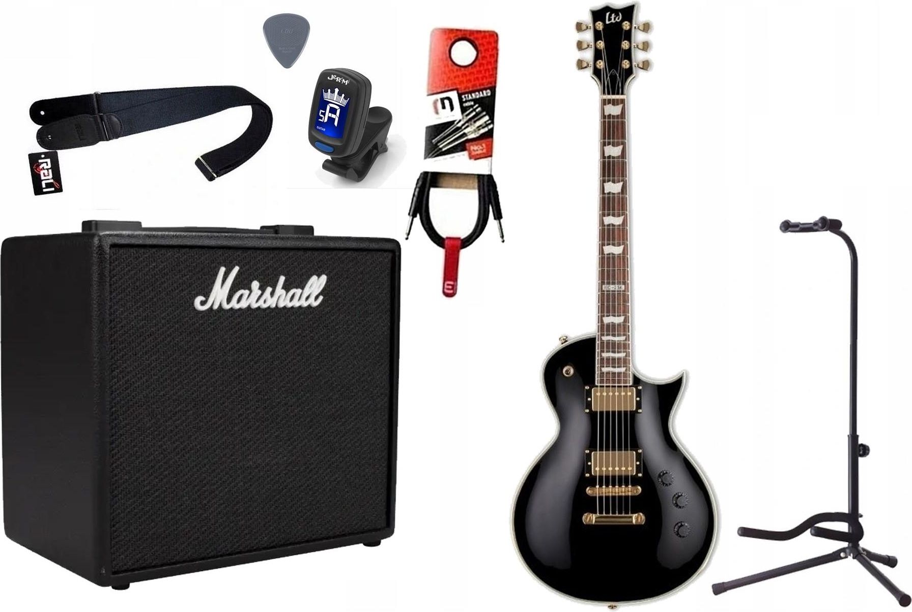 GITARA ELEKTRYCZNA + WZMACNIACZ 25W KABEL ZESTAW Kompletny zestaw gitarowy, w zestawie: 1 x Gitara Elektryczna (opis poniżej), 1x Wzmacniacz gitarowy Marshall Code 25W, 1x Pasek gitarowy Rali, 1x Tuner chromatyczny, 1x kabel gitarowy 3 metrowy, 1x statyw gitarowym, 1x kostka gitarowa Janicek LTD EC …