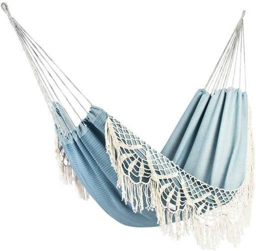 Wygodny i jednocześnie zgodny z najnowszymi trendami mody hamak będzie praktycznym i stylowym dodatkiem każdego miejsca. Tradycyjny hamak bez drążków, jest bardzo duży i wytrzymały. Spokojnie może z niego korzystać dwoje dorosłych osób bądź kilkoro dzieci. Ze względu na rozmiary najlepiej sprawdza się w ogrodzie lub na tarasie. Boki hamaka są ozdobione fantazyjną falbaną w stylu boho wykonaną z bawełnianych, plecionych sznurków, dlatego każdemu miejscu doda on stylu i modnego wyglądu. Maksymalne obciążenie hamaka - 160kg, długość - 380 cm, waga - 2,5 kg.