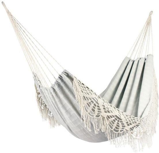 Wygodny i jednocześnie zgodny z najnowszymi trendami mody hamak będzie praktycznym i stylowym dodatkiem każdego miejsca. Tradycyjny hamak bez drążków, jest bardzo duży i wytrzymały. Spokojnie może z niego korzystać dwoje dorosłych osób bądź kilkoro dzieci. Ze względu na rozmiary najlepiej sprawdza się w ogrodzie lub na tarasie. Boki hamaka są ozdobione fantazyjną falbaną w stylu boho wykonaną z bawełnianych, plecionych sznurków, dlatego każdemu miejscu doda on stylu i modnego wyglądu. Maksymalne obciążenie hamaka - 160kg, długość - 380 cm, waga - 2,5 kg.