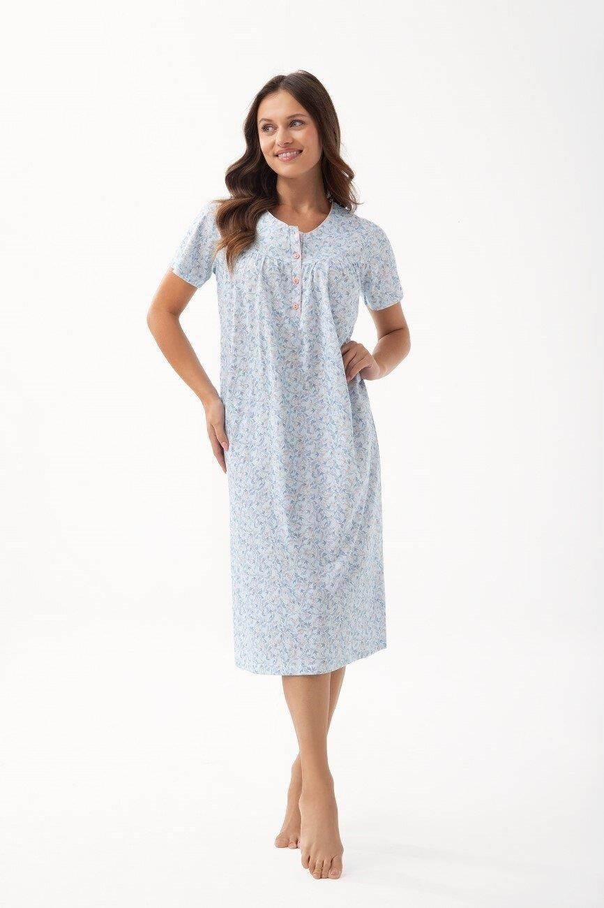 Koszula nocna damska z krótkim rękawem wysoka jakość wzorzystej bawełny dekolt lekko marszczony, zapinany na guziki długość do kolan Skład: 100% bawełna