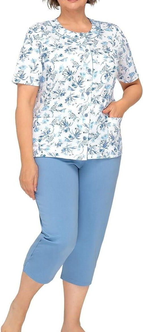 Piżama damska z delikatnej bawełny koszulka zdobiona kwiatowym wzorem z krótkim rękawem półokrągły dekolt zapinany na guziki gładkie spodnie o długości 3/4 Skład: 100% bawełna