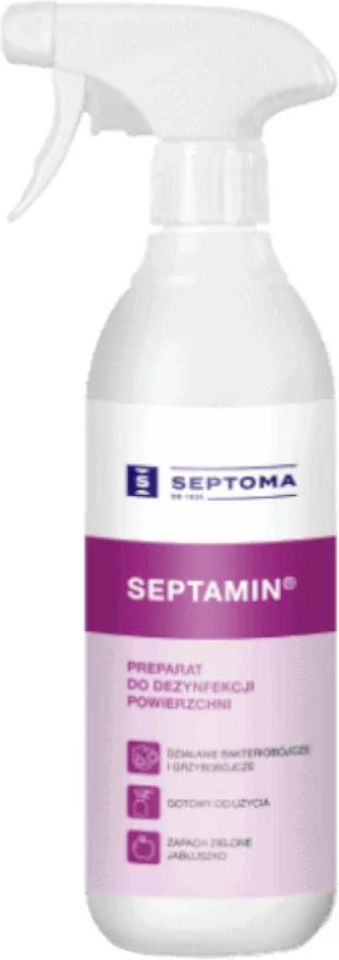 SEPTAMIN Spray do dezynfekcji 500ml SEPTAMIN Spray do dezynfekcji 500ml Alkoholowy preparat do dezynfekcji powierzchni (dezynfekcja ogólna ścian, podłóg, toalet, blatów niemających kontaktu z żywnością) w warunkach przemysłowych i domowych oraz zakładach użyteczności publicznej. Preparat działa bakteriobójczo i grzybobójczo. Działanie bakteriobójcze w czasie 5 min. Działanie grzybobójcze w czasie 15 min. Sposób użycia: Dezynfekowaną powierzchnię spryskać preparatem i przetrzeć ściereczką lub pozostawić do wyschnięcia. Skład: Substancje czynne w 100 g produktu: Etanol 66,5 g, Propan-2-ol 10 g
