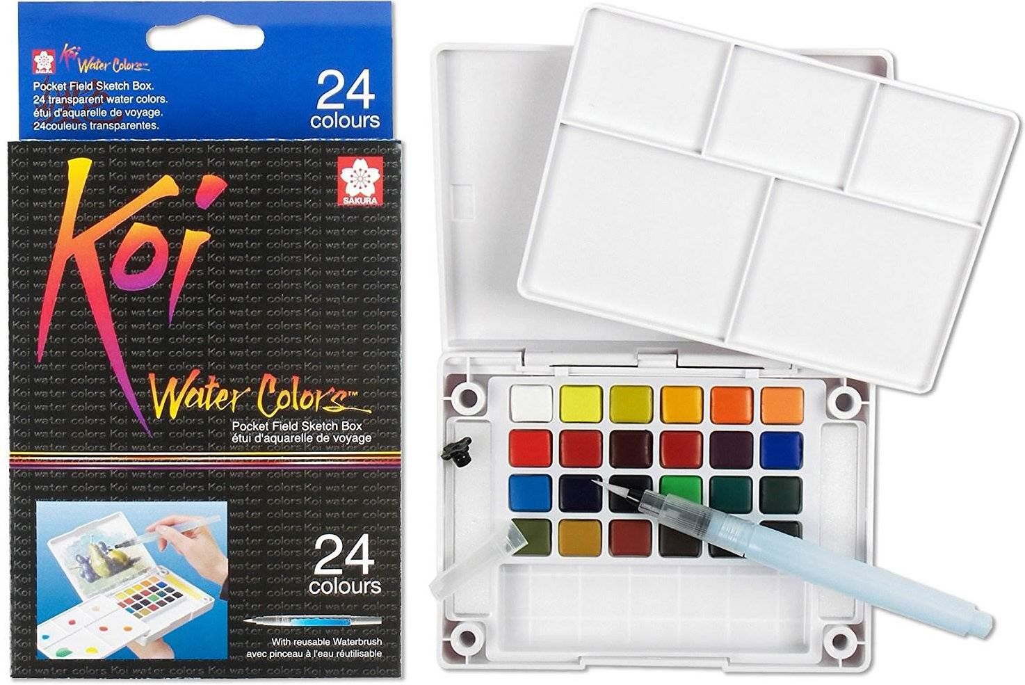 Sakura Koi Watercolor Field Sketch Box Set - 24 Color Palette Water Brush Farby akwarelowe zestaw podréczny zestaw zawiera 24 kolory farb i 1x pédzel 1x paleta do miesznia Aureoline Hue, Burnt Umber, Cadmium Red Hue, Cerulean Blue, Chinese White, Cobalt Blue Hue, Crimson Lake, Ivory Black, Juane Brilliant, Lemon Yellow, Light Red, Olive Green, Payne's Grey, Permanent Green Deep, Permanent Orange, Permanent Yellow Deep, Prussian Blue, Purple, Quinacridone Rose, Ultramarine, Vermillion Hue, Viridian Hue, Yellow Green, Yellow Ochre