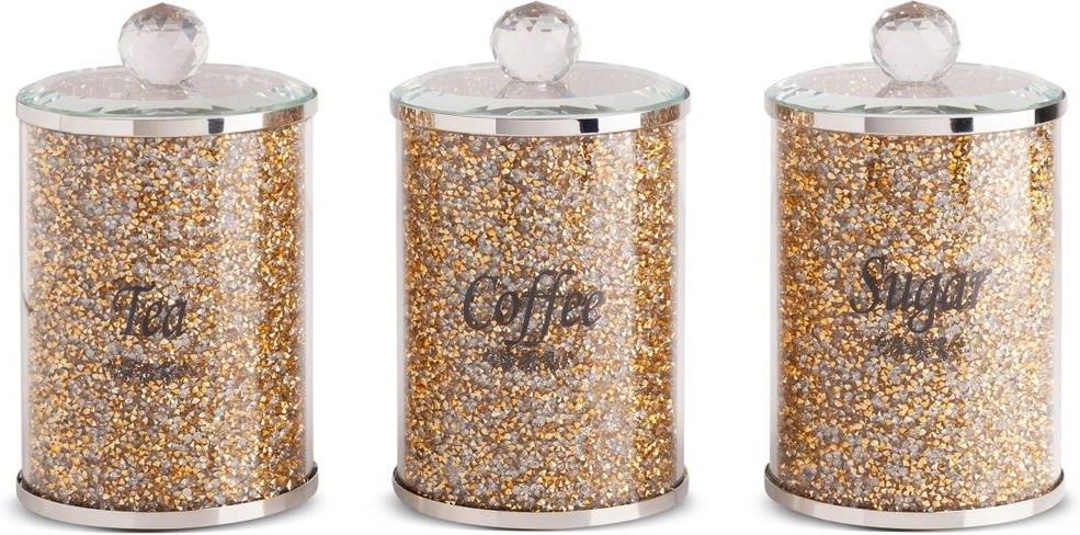 Szukasz eleganckich i oryginalnych dodatków kuchennych? Uwielbiasz styl glamour? Z pewnością nie przejdziesz obojętnie obok naszej propozycji szklanych pojemników w stylu glamour. Szklany pojemnik, którego podwójne szklane ścianki wysypane są drobnymi kryształkami i nakryty szklanym wieczkiem to prawdziwy diament we wnętrzu. Praktyczny pojemnik przechowa każdy drobiazg, który zechcesz w nim umieścić, przyda się w kuchni, łazience, czy salonie. Kolor: złoty Średnica: 10 cm Wysokość: 17 cm Skład: szkło