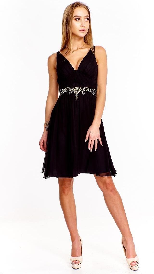 Fason: rozkloszowana Dekolt przód: szpic Plecy: odkryte częściowo Zapięcie: suwak kryty z boku Materiał: tkanina zwiewna, podszewka Długość całkowita: mini Szerokie ramiączka Ozdoby: kamienie, cekiny koraliki, draperia Skład: 100% jedwab