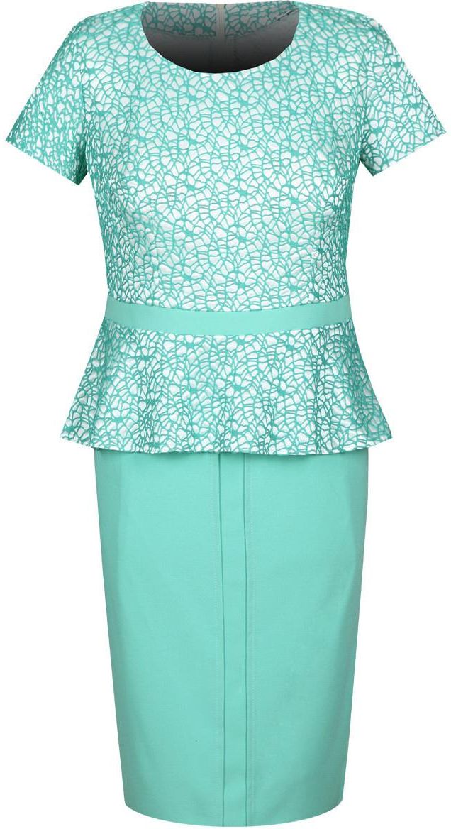 Spódnica: midi, prosta suwak kryty z tyłu rozporek z tyłu tkanina elastyczna - krepa, podszewka Bluzka: odcięta w pasie, baskinka dekolt okrągły suwak kryty z tyłu rękaw krótki dzianina strukturalna - koronka