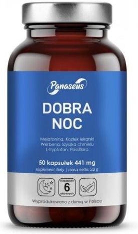 Kapsułki Panaseus Dobra Noc 50 szt. Dobrze przespana noc to klucz do zdrowia i witalności. Suplement diety, jakim są Kapsułki Panaseus Dobra Noc, został zaprojektowany, aby pomóc osobom zmagającym się z problemami ze snem. Dzięki starannie dobranym składnikom, ten preparat wspiera układ nerwowy i ułatwi zasypianie, co pozwoli Ci cieszyć się pełnią energii na co dzień. Pojemność i forma Suplement występuje w wygodnym opakowaniu zawierającym 50 kapsułek, co wystarcza na 50 dni stosowania przy zalecanym dawkowaniu jednej kapsułki dziennie. Kapsułki wykonane są z celulozy roślinnej, co czyni je odpowiednimi dla wegetarian i wegan. Aby uzyskać najlepsze efekty, przyjmuj je na 30 minut przed snem, popijając dużą ilością wody. Skład W każdej kapsułce znajdują się starannie dobrane składniki aktywne, które wspierają zdrowy sen: W składzie znajdziesz: Melatonina: 1 mg – reguluje rytm snu i przyspiesza zasypianie, Kozłek lekarski (ekstrakt): 100 mg – naturalny składnik znany z właściwości uspokajających, Werbena (ekstrakt 10:1): 80 mg – sprzyja relaksacji i wyciszeniu, Szyszka chmielu (ekstrakt 10:1): 40 mg – działa kojąco i wspiera dobry sen, L-tryptofan: 20 mg – aminokwas potrzebny do produkcji serotoniny, Passiflora (ekstrakt): 20 mg – znana z właściwości uspokajających. Działanie suplementu Dzięki unikalnej formule, ten suplement oferuje szereg korzystnych efektów: Skrócenie czasu zasypiania: Melatonina i kozłek lekarski przyspieszają proces zasypiania, Poprawa jakości snu: Składniki wspierają głęboki i regenerujący sen, Redukcja stresu i napięcia: Działa relaksująco, co ułatwia wyciszenie przed snem, Wsparcie układu nerwowego: Pomaga w poprawie ogólnego samopoczucia psychicznego. Wskazania do stosowania Kapsułki Panaseus Dobra Noc są idealnym rozwiązaniem dla osób, które: Miewają trudności z zasypianiem, Chcą poprawić jakość swojego snu, Potrzebują naturalnych metod na redukcję stresu i napięcia. Dawkowanie Zalecana dawka to jedna kapsułka dziennie, przyjmowana na 30 minut przed snem. To prosty sposób na wprowadzenie suplementacji do codziennej rutyny, który pomoże Ci zasnąć łatwiej i szybciej. Przeciwwskazania i bezpieczeństwo Przed rozpoczęciem stosowania należy pamiętać o kilku kluczowych kwestiach: Preparat nie jest zalecany dla dzieci, kobiet w ciąży oraz karmiących, Osoby przyjmujące leki powinny skonsultować się z lekarzem przed zastosowaniem. Informacje dodatkowe Kapsułki Panaseus Dobra Noc są wolne od metali ciężkich i sztucznych dodatków, co czyni je bezpiecznym wyborem dla każdego. Polski producent Panaseus dba o wysoką jakość i skuteczność produktu, co pozwala Ci cieszyć się spokojnym snem bez obaw.