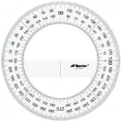 Leniar kątomierz wykonany z prześroczystej plexi średnica 25cm nadrukowany kątomierz 0 -360 stopni podziałka co 1 stopień w dwóch kierunkach opakowanie: etui folia