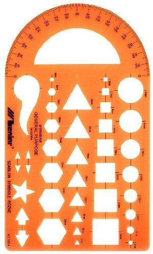 Leniar szablon z różnymi symbolami: wykonany z przeźroczystego, bardzo elastycznego tworzywo wielkość: 240x 140 mm grubość: 0,6mm sześciokątami, kołami, kwadratami i trójkątami dodatkowo symbole strzałek, gwiazdka nadrukowany kątomierz 180o opakowanie: blister