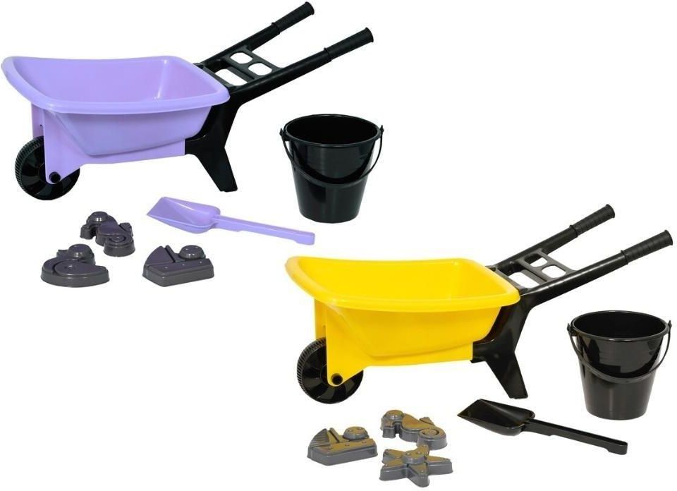 Taczka 56 cm z wiaderkiem, łopatką i foremkami. Wymiary: 25/56/26Waga: 0,57 kgZestaw: Taczka i 5 elementów do zabawy w piasku. Dwa kolory. Żółty/Liliowy.Dla małego ogrodnika! Wysokiej jakości zestaw ogrodniczy Plasto zawiera taczkę, wiadro, łopatę i trzy foremki do piasku. Długość taczki 56 cm. …