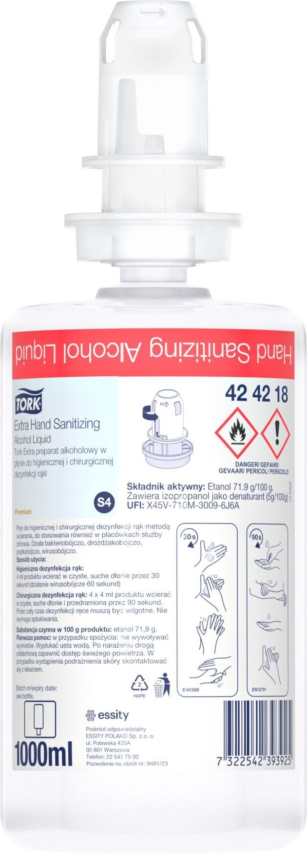Zapobiegaj infekcjom dzięki Tork Ekstra preparatowi w płynie do dezynfekcji rąk, który skutecznie eliminuje mikroorganizmy, spełniając normy międzynarodowe i zapewniając uczucie miękkości skóry, przy jednoczesnym zmniejszeniu ilości odpadów dzięki innowac. Zapobiegaj infekcjom dzięki najskuteczniejszemu i najszybciej działającemu preparatowi dezynfekującemu, Tork Ekstra w płynie do dezynfekcji rąk z alkoholem. Zabijając szerokie spektrum mikroorganizmów, spełnia wymogi chirurgicznej dezynfekcji rąk oraz zgodny jest z 5 momentami WHO. Skutecznie zwalcza wiele typów problematycznych mikroorganizmów zgodnie z normami EN13727, EN1500 (w 30 sekund), EN 12791 (w 90 sekund) i EN14476 (wirusy osłonkowe oraz norowirusy w 15 sekund). Testowany dermatologicznie, zawiera allantoinę oraz glicerynę, pomagając zachować uczucie miękkości skóry oraz zwiększyć jej nawilżenie przy długotrwałym stosowaniu. Dzięki innowacyjnemu systemowi uzupełniania, skraca czas pracy personelu sprzątającego, ograniczając ilość odpadów o 70%.
