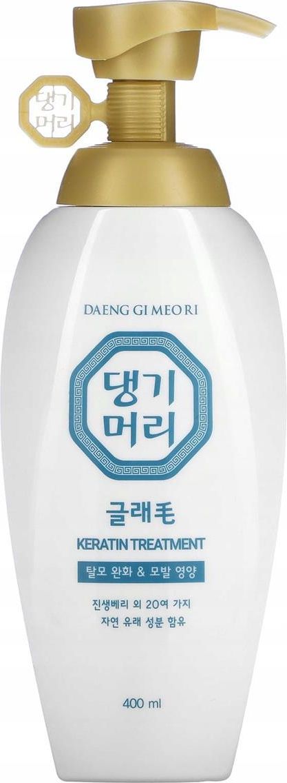 Daeng Gi Meo Ri - Glamo Keratin Treatment 400ml Poznaj sekret lśniących, mocnych i elastycznych włosów prosto z Korei! Daeng Gi Meo Ri - Glamo Keratin Treatment 400ml to wyjątkowy kosmetyk stworzony z myślą o kompleksowej pielęgnacji włosów, zwłaszcza tych osłabionych, suchych czy pozbawionych energii. Formuła wzbogacona keratyną oraz mieszanką roślinnych ekstraktów sprawia, że każdy kosmyk zyskuje blask, jedwabistość i wyjątkową miękkość. Korzyści Intensywna odbudowa i wygładzenie struktury włosa Wyjątkowy blask i głębokie nawilżenie Miękkość i łatwiejsze rozczesywanie bez efektu obciążenia Odżywienie i poprawa sprężystości włosów Podkreślenie naturalnego piękna oraz zwiększenie objętości Łagodzenie podrażnień skóry głowy i przywrócenie komfortu Wzmocnienie od nasady po same końce Popularne składniki i ich rola Keratyna hydrolizowana – budulec włosa, wygładza, nabłyszcza i wzmacnia, sprawiając że włosy są elastyczne i pełne życia Olej z awokado – intensywnie nawilża, poprawia miękkość oraz uelastycznia strukturę włosa Pantenol (Pro-witamina B5) – pielęgnuje, nadaje jedwabistą gładkość i zatrzymuje wilgoć we włosach Ekstrakt z żeń-szenia – wpływa na witalność, pobudza i wzmacnia Skwalan i niacynamid – zwiększają odporność włosów i nadają im blasku Jak stosować? Umyj włosy swoim ulubionym szamponem i delikatnie osusz ręcznikiem. Nanieś Daeng Gi Meo Ri - Glamo Keratin Treatment 400ml na długości włosów, szczególnie uwzględniając ich końce. Pozostaw na 2-5 minut, by składniki aktywne zadziałały w pełni. Dokładnie spłucz ciepłą wodą. Stosuj regularnie, aby cieszyć się silniejszymi, bardziej lśniącymi włosami każdego dnia.