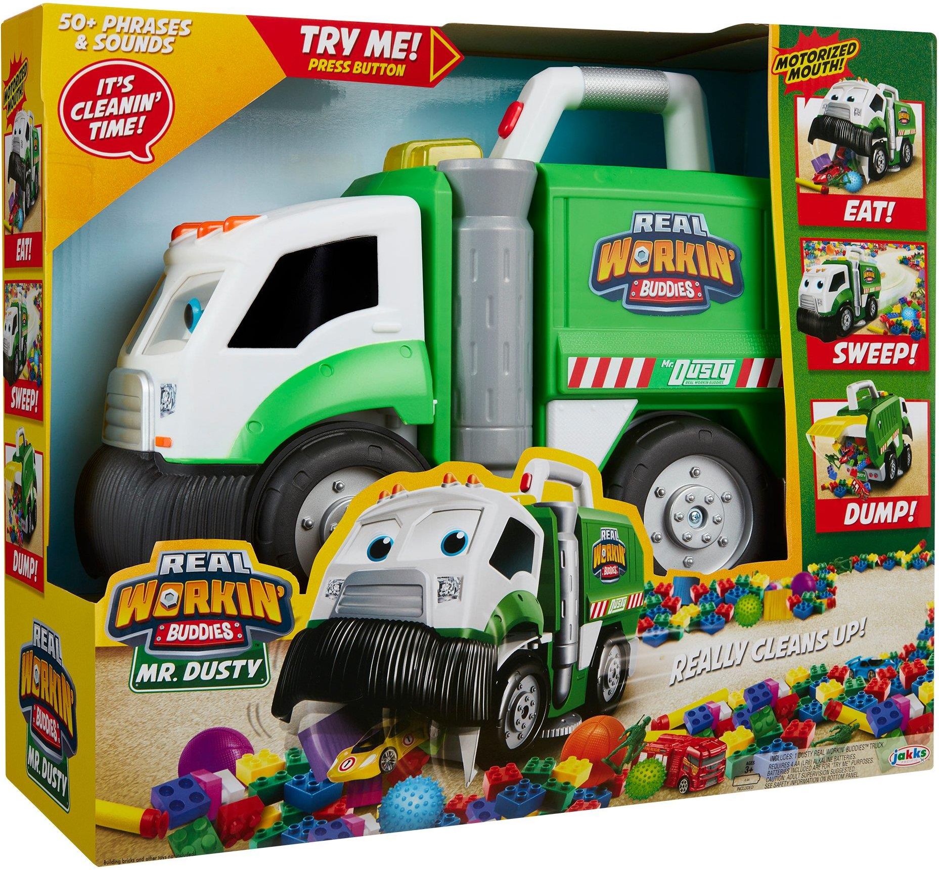 Toys everywhere? Not a problem anymore! Real Workin’ Buddies: Mr. Dusty is the ultimate toy-cleaning sidekick. Designed for kids aged 3 and up, Mr. Dusty makes cleaning fun with 3 unique modes: Sweep It Up, Eat It Up, and Dump It Out. He picks up small toys like building bricks and cars with ease, and even larger toys (up to 2” tall) with his motorized mouth! Mr. Dusty brings personality to cleanup time with over 50 fun phrases, realistic lights, and silly sounds. He works on carpets and hard floors, so no mess is too big. Parents love the help, and kids love the fun! Motorized Mouth: Push the handle button to activate Mr. Dusty’s “eating” feature! Fun Sounds and Lights: Over 50 phrases and silly effects keep kids engaged. 3 Ways to Play: Sweep, Eat, and Dump! Battery Info: Requires 4 AA batteries (included). Product Dimensions: 13" W x 5.25" D x 9.5" H Weight: 3.4 lbs Age Grade: 3+