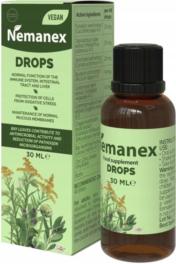 Nemanex to nowoczesny suplement, który może stanowić cenne wsparcie dla osób zmagających się z problemami układu pokarmowego oraz z przewlekłym uczuciem zmęczenia. Preparat wyróżnia się naturalnym składem, a jego działanie obejmuje kilka obszarów: Wsparcie trawienia – Nemanex może łagodzić dolegliwości takie jak wzdęcia, zgaga, niestrawność czy biegunki. Dzięki swoim właściwościom wspomaga prawidłowe funkcjonowanie przewodu pokarmowego i sprzyja utrzymaniu komfortu jelitowego. Detoksykacja organizmu – regularne stosowanie preparatu przyczynia się do usuwania nagromadzonych toksyn, co pozytywnie wpływa na kondycję całego ciała. Naturalne składniki kropli stymulują procesy oczyszczania i wspierają równowagę wewnętrzną. Zmniejszenie uczucia zmęczenia – osoby cierpiące na brak energii mogą odczuć poprawę dzięki właściwościom wzmacniającym Nemanex. Preparat pomaga odzyskać siły witalne, co ułatwia codzienne funkcjonowanie i zwiększa wydajność. Ukojenie dla nóg – Nemanex może również wspierać osoby odczuwające ból lub ciężkość nóg. Dzięki właściwościom łagodzącym i przeciwzapalnym, preparat przynosi ulgę szczególnie tym, którzy spędzają wiele godzin w pozycji siedzącej lub stojącej. Krople Nemanex zostały opracowane na bazie starannie dobranych, naturalnych składników, które wzajemnie się uzupełniają, aby wspierać prawidłowe funkcjonowanie układu pokarmowego oraz poprawiać ogólne samopoczucie. Każdy z ekstraktów pełni ważną rolę w działaniu preparatu: Ekstrakt z bulwy topinamburu – topinambur jest cennym źródłem inuliny, czyli naturalnego prebiotyku wspierającego rozwój korzystnych bakterii jelitowych. Dzięki temu pomaga utrzymać zdrową florę jelitową i zapobiega niepożądanym procesom w jelitach. Dodatkowo wspiera oczyszczanie organizmu po przebytych infekcjach pasożytniczych. Ekstrakt z liści karczocha – karczoch znany jest z właściwości ochronnych wobec wątroby. Substancje aktywne zawarte w jego liściach sprzyjają usuwaniu pasożytów i ich form przetrwalnikowych, co przyczynia się do skuteczniejszego oczyszczenia układu pokarmowego. Ekstrakt z korzenia łopianu – łopian wspomaga procesy oczyszczania, aktywizując pracę wątroby i nerek. Przywraca równowagę metaboliczną i korzystnie wpływa na funkcjonowanie narządów wewnętrznych. Ekstrakt z orzecha włoskiego – bogaty w polifenole i kwasy omega-3, wspiera prawidłową pracę wątroby i nerek. Dzięki swoim właściwościom odżywczym i antyoksydacyjnym, pomaga w naturalnym usuwaniu toksyn i wzmacnia organizm. Nemanex Krople Vegan Naturalny kompleks 10 wyselekcjonowanych składników aktywnych · Ekstrakt z pestek dyni · Ekstrakt z bulw topinamburu · Ekstrakt z liści orzecha włoskiego · Ekstrakt z liści karczocha · Ekstrakt z korzenia łopianu · Ekstrakt z łodyg nawłoci · Ekstrakt z chaga · Ekstrakt z liści laurowych · Cynk · Biotyna Stosowanie Nemanex Dorośli powinni przyjmować 20 kropli dwa razy dziennie przed posiłkami, rozpuszczonych w 100 ml wody. W razie potrzeby krople można również dodawać do napojów lub żywności. Czas stosowania wynosi 2 miesiące. Przed użyciem należy dobrze wstrząsnąć. Zalecana dzienna dawka: 40 kropli Lista składników Nemanex Rozpuszczalnik (woda, alkohol etylowy 22% obj.), stabilizator (glicerol roślinny), ekstrakt z pestek dyni, ekstrakt z bulw topinamburu, ekstrakt z liści karczocha, regulator kwasowości (kwas cytrynowy), cytrynian cynku trójwodny, ekstrakt z korzenia łopianu, ekstrakt z nawłoci, ekstrakt z liści orzecha włoskiego, ekstrakt z owoców Schier Schillerporling, ekstrakt z liści laurowych, biotyna. Alergeny i informacje Nemanex Zawiera 22% objętości alkoholu, Indywidualna nietolerancja składników. Ważna informacja: Niniejsze oświadczenia nie zostały ocenione przez Europejski Urząd ds. Bezpieczeństwa Żywności (EFSA). Ten produkt nie jest przeznaczony do diagnozowania, leczenia ani zapobiegania jakimkolwiek chorobom. Przechowywać w miejscu niedostępnych dla małych dzieci. Produkt nieodpowiedni dla kobiet w ciąży, karmiących piersią i dzieci. W razie wątpliwości przed zastosowaniem produktu należy zasięgnąć porady lekarza lub farmaceuty. Nie jest to produkt medyczny.