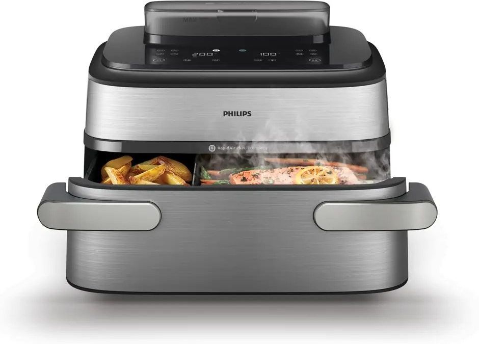 Philips Ovi Ultra seria 5000 NA565/02 Elastyczny Megabasket do funkcji Steamfry, Steam lub Airfry Więcej tekstur, nowe smaki, łatwiejsze czyszczenie Philips Ovi Ultra Megabasket dostosowuje się do Twoich potrzeb z jednym bardzo dużym koszem (9.5L) lub dwoma koszami (3L + 6L). Funkcja Steamfry, gotowania na parze lub smażenie gorącym powietrzem zapewniają soczyste, delikatne i chrupiące rezultaty. Od niedzielnych pieczeni po kolorowe warzywa. Idealne rodzinne posiłki za każdym razem. Elastyczny kosz, który dostosowuje się do każdej okazji Niezależnie od tego, czy przygotowujesz kolację we dwoje, czy posiłek dla całej rodziny, zawsze jesteś gotowy. Gotuj w dwóch oddzielnych koszach 3l +6l dla codziennej wygody lub przekształć je w jeden ogromny Megabasket o pojemności około 9.5 I na najważniejsze posiłki -wystarczająco duży na 2,5 kg frytek, 1,9 kg żeberek lub całego kurczaka. Korzystaj jednocześnie z funkcji Steamfry, gotowania na parze lub smażenia gorącym powietrzem, aby za każdym razem uzyskać idealną teksturę. Odkryj nowe tekstury dzięki funkcji Steamfry Para i gorące powietrze współpracują ze sobą, zapewniając rezultaty wykraczające poza chrupkość - zatrzymują wilgoć, zwiększają delikatność i tworzą tekstury, które są zarówno soczyste, jak i złociste, dając to, co najlepsze z obu światów. Idealne do złocistej pizzy, chrupiącego chleba, soczystego kurczaka i pieczonych warzyw w Philips Ovi Ultra z funkcją Steamfry. Zachowaj składniki odżywcze dzięki parze Technologia pary zachowuje do 93% składników odżywczych*, tworząc jedwabiste, delikatne tekstury, które rozpływają się w ustach. Od puszystych pierogów po perfekcyjnie przygotowanego na parze łososia, warzywa, które pozostają soczyste i chrupiące. Zdrowe gotowanie, które naprawdę smakuje wyśmienicie i jest uwielbiane przez przyjaciół i rodzinę. Jedno urządzenie, nieskończone możliwości - 28 sposobów gotowania 28 różnych sposobów gotowania oznacza, że możesz gotować warzywa na parze, smażyć kurczaka gorącym powietrzem, piec desery, grillować ryby, piec ziemniaki, podgrzewać resztki, a nawet łączyć parę i smażenie gorącym powietrzem dla uzyskania wyjątkowych rezultatów. Wybieraj spośród 8 zaprogramowanych ustawień, aby za każdym razem uzyskać doskonałe rezultaty, lub odkrywaj dodatkowe programy w aplikacji HomeID, aby rozwinąć swoją kreatywność. Ustawienia mogą być tak niskie jak 40°C i tak długie jak 24 godziny do suszenia i fermentacji. Wszechstronność, aby przygotować wszystko, na co ma ochotę Twoja rodzina, w jednym urządzeniu Philips Ovi Ultra z funkcją Steamfry. Podgrzewanie sprawia, że resztki i chrupiący kurczak smakują jak nowe Przemień wczorajszy posiłek w dzisiejszą rozkosz dzięki trzem dostosowanym trybom podgrzewania.**** Podgrzewaj w trybie Steamfry, Steam lub Airfry, aby kurczak pozostał chrupiący, ciasto wilgotne, a frytki złociste - dokładnie takie, jakie były po pierwszym przygotowaniu. Pomiń rozczarowanie mikrofalówką i ciesz się resztkami, które smakują jak świeżo przygotowane. Idealne dla zapracowanych rodzin, które przygotowują posiłki z wyprzedzeniem lub po prostu chcą cieszyć się świetnym jedzeniem dwa razy. Premium powłoka ceramiczna - trwała, bezpieczna i łatwa w czyszczeniu Ciesz się gotowaniem z pewnością dzięki naszej zaawansowanej ceramicznej powłoce. Nieprzywierająca, odporna na plamy powierzchnia pozostaje gładka i łatwa do czyszczenia nawet przy codziennym użytkowaniu przez rodzinę, a konstrukcja powłoki bez PFAS zapewnia spokój ducha. Zbudowana, aby przetrwać niezliczone rodzinne posiłki, można ją myć w zmywarce, jest trwała i zaprojektowana tak, aby zachować swoją wydajność przez lata. Wysokiej jakości materiały, które dorównują Twojemu zaangażowaniu w doskonałe gotowanie. Wykorzystaj pełny potencjał swojego Philips Ovi Ultra Megabasket dzięki aplikacji HomeID Odkryj nieograniczone możliwości dzięki bezpłatnej aplikacji HomeID. Odblokuj więcej zaprogramowanych ustawień i uzyskaj szczegółowe wskazówki dotyczące korzystania, czyszczenia i opanowania swojego urządzenia Philips Ovi, ułatwiając stosowanie technik gotowania na parze i Steamfry. Znajdź setki przepisów, porad i inspiracji społeczności, które pomogą Ci gotować z pewnością siebie i kreatywnością. *Pomiar zewnętrznego laboratorium, na podstawie wskaźnika zachowania witaminy C w porównaniu z nieugotowanymi różyczkami brokułów. **Aby uzyskać optymalne rezultaty, użyj funkcji czyszczenia parą w dużym koszu przez 15 minut po każdym użyciu. ***W porównaniu z frytkami przygotowanymi w tradycyjnej głębokiej frytkownicy *w porównaniu z urządzeniami Philips Ovi z technologią RapidAir. ****Do podgrzewania dozwolone jest używanie wyłącznie pojemników ze szkła, folii aluminiowej, ceramiki i stali nierdzewnej. *****Liczba przepisów może się różnić w zależności od kraju. ******Wewnętrzny pomiar laboratoryjny NA56x z łososiem w porównaniu z piekarnikiem klasy A. Wyniki mogą się różnić w zależności od przepisu.