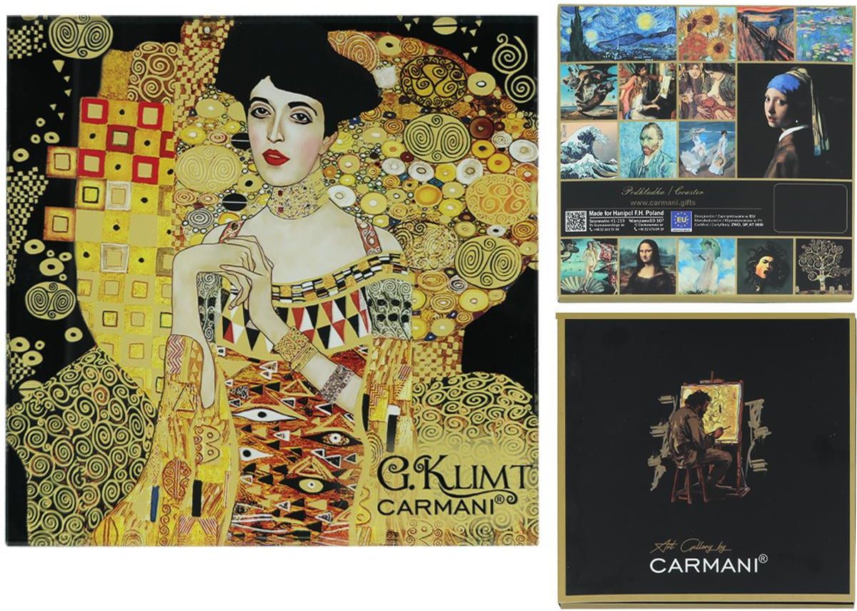 Ożyw swój stół... ... o oryginalnym motywie inspirowanym twórczością Gustava Klimta szklaną podkładką pod kubek firmowaną marką Carmani z silikonowym zabezpieczeniem antypoślizgowym(patrz-zdjęcie; przyklejone stopki pod podkładką) o wymiarach dla podkładek o takim przeznaczeniu = około 11,5x11,5cm W KILKU ZDANIACH O CARMANI...Marka "Carmani" ceniona jest przede wszystkim za bardzo dobre wykonanie, z dbałością o szczegóły oraz atrakcyjny design i ceny.Pod marką Carmani odnajdziecie zawsze produkty wysokiej jakości jak np. filiżanki i kubki porcelanowe, serwisy oraz komplety porcelanowe, figurki, szkło i sztućce itp., z popularnymi, znanymi i cenionymi motywami jak m.in.: kolekcje malarstwa: Vincenta van Gogha, Moneta, Alfonsa Muchy, Gustava Klimta czy coraz bardziej popularnego - Modigliani'egoCiekawostką jest fakt, że porcelana z malarstwem Renoira, van Gogha i Klimta sprzedawana jest przez nas do europejskich muzeów w/w artystów jako gadżety związane z nimi :)