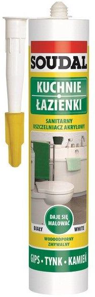 Sanitarny uszczelniacz akrylowy marki Soudal, 280 ml, biały. Jednoskładnikowy trwale elastyczny uszczelniacz silikonowy o utwardzaniu kwaśnym i podwyższonej odporności na działanie wilgoci, grzybów i pleśni. Przeznaczony do wypełniania szczelin między płytkami a urządzeniami sanitarnymi, np. wokół wanien, brodzików, umywalek, a także wokół mebli kuchennych. Służy również do spoinowania okładzin ceramicznych, szczególnie w narożach ścian, w połączeniach ścian z podłogą i w miejscach przebiegu dylatacji. Charakteryzuje się doskonałą przyczepnością do typowych podłoży sanitarnych - szkła, ceramiki i powierzchni szkliwionych oraz betonu i cegły, drewna i niektórych metali.