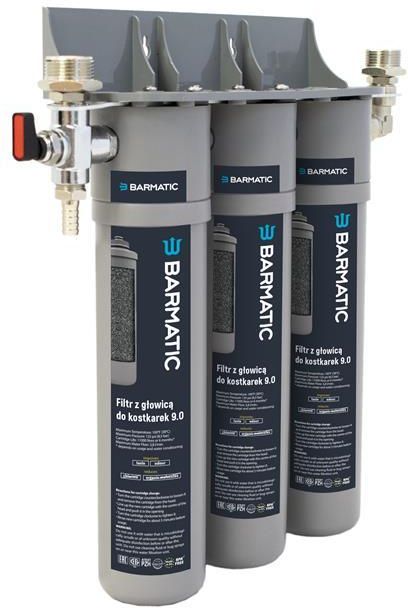 Wkłady do filtra do kostkarek 9.0 marki Barmatic – zestaw wymiennych wkładów. Stosowanie świeżych wkładów do filtrów zapewnia ich prawidłową pracę i utrzymanie higieny urządzenia. Wydajność przepływowa 90 tys. litrów. Stacja filtracji wody do zastosowania w wytwornicach lodu barowego posiada potrójny układ uzdatniania. Pierwszym etapem jest uzyskanie klarowności wody – dzięki usunięciu zanieczyszczeń stałych powyżej 20 mikronów. Drugim etapem jest pozbycie się chloru i jego pochodnych mających wpływ na smak i zapach. Ostatnim działaniem jest neutralizacja węglanu wapnia co zapobiega osadzaniu się kamienia na powierzchniach mających kontakt z wodą. Filtry serii 9.0 są doskonałym rozwiązaniem gwarantującym znakomitą jakość lodu i mają wpływ na żywotność wytwornic lodu. System pozwala uzyskać maksymalny przepływ wody na poziomie 1 l/minutę. Maksymalna twardość wody 500 ppm. Maksymalne ciśnienie pracy 6 bar. Podłączenia kompatybilne z kostkarkami BARMATIC i ICEMATIC. Stacja wyposażona jest w trójdrożny zawór ułatwiający wypłukanie i odpowietrzenie układu filtrującego. ZDJĘCIEPOGLĄDOWE