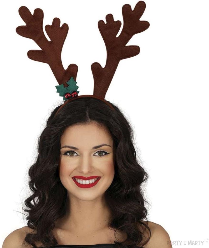 Opaska z rogami renifera, ozdobiona ostrokrzewem i dzwoneczkami. Rogi renifera to klasyczny element świątecznych dekoracji i przebrań świątecznych. Bo nie kto inny, jak dzielne renifery ciągną sanie Mikołaja wypełnione prezentami. Świąteczna opaska z rogami Renifera doskonale sprawdzi się podczas firmowych spotkań świątecznych czy szkolnej wigilii.