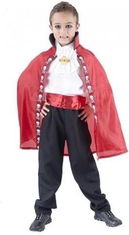 Kostium Wampira zawiera: pelerynę z kołnierzem żabot z przypinką Materiał: tkanina poliestrowa a'la satyna.Peleryna oraz żabot zapinane na rzepy.Przebranie Wampira doskonale sprawdzi się podczas Halloweenowej imprezy. opis/rozmiar 120/130 cm długość całkowita 71 cm wysokość kołnierza 8 cm