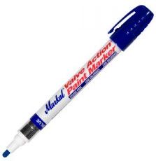 marker przemysłowy kryjący Valve Action® Paint wzmocniona końcówka pisząca (szerokość 3 mm) pozwala na długą żywotność markera oraz uzyskanie wyraźnych napisów widocznych z większej odległości; w przypadku zużycia końcowkę można wymieniać kolor: niebieski stosowany do znakowania metalu, drewna, szkła, plastiku, gumy, tektury, papieru i innych powierzchni zawiera trwałą, bezołowiową farbę kryjącą (nieprzezroczystą), wodoodporną, odporną na warunki atmosferyczne, promieniowanie UV, specjalnie opracowany zawór pozwala na kontrolowanie wypływu farby i uzyskanie ciagłej nieprzerywanej linii podczas pisania obudowa markera wykonana z metalu zakres temperatur stosowania markera -46°C do 66°C wysycha w czasie ok. 45 sek -3 minut (w zależności od typu powierzchni i temperatury otoczenia) produkt amerykańskiej firmy Markal LA-CO produkowane kolory: biały, żółty, czerwony, czarny, niebieski, zielony, pomarańczowy, fioletowy, brązowy, różowy, jasno niebieski, jasno zielony, srebrny (aluminium), złoty, fluorescencyjny żółty, fluorescencyjny pomarańczowy, fluorescencyjny różowy, fluorescencyjny zielony farba nie zawiera ksylenu, spełnia normy bezpieczeństwa