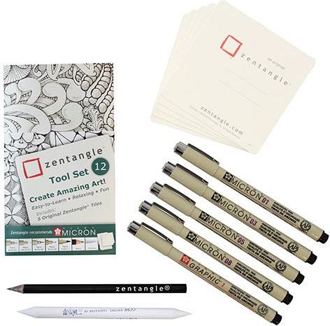 Sakura Zentangle Markery- mix12 sztuk Sakura Zentangle Pigma Micron profesjonalne cienkopisy o niezrównanej jakości zawdzięczają przede wszystkim tuszowi Archival, który charakteryzuje się głęboką czernią, permanentnością, wodoodpornością oraz stabilnym, napigmentowanym tuszem zaletą jest także fakt, że skład tuszu jest nietoksyczny i całkowicie bezpieczny dla zdrowia i środowiska końcówka cienkopisu odpowiednio dozuje tusz, nie drapie papieru i jest niezwykle wytrzymała oraz stawia precyzyjne linie pozbawione poszarpanych brzegów; końcówka w precyzyjnej stalowej rurce umożliwia także na idealne kreślenie przy linijce linie wykonane tymi cienkopisami są bardzo światłotrwałe, nie blakną z upływem czasu nie przebijają na drugą stronę nawet najcieńszego papieru produkt, po który chętnie sięgają ilustratorzy, rysownicy komiksów, mangi, architekci,pisarze i artyści, którzy stawiają na profesjonalne cienkopisy w przystępnej cenie. zestaw zawiera: Pigma Micron cienkopisy o grubosci linii 01, 03, 05, 08 Pigma Graphic cienkopis (1) 1x grafit ołówkowy Bruynzeel 1x wiszer Bruynzeel 5x arkuszy specjalnego białego papieru 65 x 90mm opakowanie: etui z tworzywa produkt holenderskiej firmy Talens