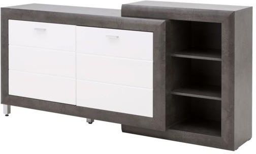 Komoda KAZBEK łączy funkcjonalność niskiego regału i zamykanej szafki. Może pełnić funkcję bufetu, służąc do przechowywania lżejszych naczyń. Jej ciekawa, asymetryczna bryła sprawia, że projekt wnętrza nabiera głębi. Pozwala poszaleć z motywem geometrycznych kształtów w aranżacji i pobudza do twórczego myślenia. Połączenie szarego wykończenia korpusów z pyskującymi frontami to kwintesencja nowoczesności. Dzięki temu we własnym salonie możesz poczuć się, jak w modnym apartamencie. Meble z kolekcji KAZBEK estetycznie wpisują się w monochromatyczne wnętrza. Przełamują konwencję loftową, dodając jej połysku. Możesz sprawić, że twoje surowe dotąd wnętrze zmieni się w szykowny, ekstrawagancki salon. WNĘTRZE Na otwartych półkach możesz układać książki lub dekoracje, tworzące wyjątkowy klimat pokoju dziennego. Za zamkniętymi drzwiami znajdują się 4 wnęki, w których zmieszczą się obrusy, lub ulubione gry planszowe. WYKOŃCZENIE Nowoczesny efekt uzyskano wykańczając meble KAZBEK folią. Aluminiowe nóżki współgrają z połyskującymi, białymi frontami. Dzięki temu meble możesz zestawić ze srebrnymi lub metalowymi dodatkami.