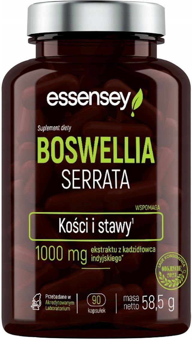ESSENCE Boswelia Serrata 90 kapsułek WYSOKIEJ JAKOŚCI PREPARAT NA BAZIE EKSTRAKTU Z BOSWELLIA SERRATA (KADZIDŁOWCA INDYJSKIEGO) KAŻDA PORCJA TO BOGATE ŹRÓDŁO KWASU BOSWELIOWEGO O POZYTYWNYM WPŁYWIE NA ORGANIZM PREPARAT WYSTĘPUJE W FORMIE KAPSUŁEK ZAPEWNIAJĄCYCH KOMFORT SUPLEMENTACJI SPRZYJA …