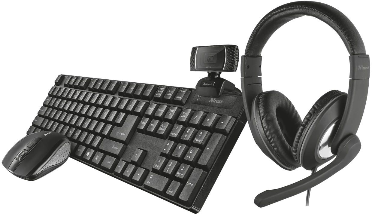 Klawiatura + mysz Trust Zestaw QOBY 4w1 (klawiatura, mysz, kamera internetowa, słuchawki) Kompletny zestaw do domowego biura zapewniający optymalną pracę Prowadź rozmowy wideo o wysokiej jakości obrazu i mowy Bezprzewodowa, pełnowymiarowa klawiatura Kompaktowa mysz bezprzewodowa z regulowaną …