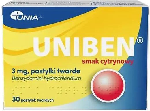 Uniben smak cytrynowy, to lek w postaci pastylek do ssania, stosowany w leczeniu bólu, obrzęku oraz zaczerwienienia, które towarzyszą stanom zapalnym jamy ustnej i gardła. Uniben smak cytrynowy, wykazuje działanie przeciwzapalne i przeciwbólowe oraz działa miejscowo znieczulająco i odkażająco. Wskazania do stosowania: Lek stosuje się do leczenia dolegliwości i objawów (ból, zaczerwienienie, obrzęk) związanych ze stanami zapalnymi jamy ustnej i gardła. Skład: Substancją czynną leku jest benzydaminy chlorowodorek (Benzydamini hydrochloridum). Jedna pastylka twarda zawiera 3 mg benzydaminy chlorowodorku (Benzydamini hydrochloridum), co odpowiada 2,68 mg benzydaminy. Substancje pomocnicze: izomalt (E 953), lewomentol, aspartam (E 951), kwas cytrynowy jednowodny (E 330), naturalny aromat cytrynowy (WONF) (zawiera m.in. d-limonen i cytral), olejek limetkowy, olejek eteryczny mięty polnej z obniżoną zawartością mentolu, żółcień chinolinowa (E 104), indygotyna (E 132). Działanie: Uniben smak cytrynowy zawiera jako substancję czynną benzydaminę, która działa przeciwzapalnie i przeciwbólowo, a także miejscowo znieczula oraz odkaża. Dawkowanie: Ten lek należy zawsze stosować dokładnie tak, jak to opisano w ulotce dla pacjenta lub według zaleceń lekarza lub farmaceuty. W razie wątpliwości należy zwrócić się do lekarza lub farmaceuty. Uniben smak cytrynowy należy powoli rozpuszczać w ustach. Pastylkę należy ssać powoli. Nie połykać i nie żuć. Dorośli: 3 pastylki na dobę. U dzieci (6 - 11 lat) ze względu na ryzyko zakrztuszenia, lek powinien być stosowany pod nadzorem osoby dorosłej. Osoby dorosłe i dzieci w wieku powyżej 6 lat: 1 pastylka 3 razy na dobę. Działania niepożądane: Jak każdy lek, lek ten może powodować działania niepożądane, chociaż nie u każdego one wystąpią. Niezbyt często występujące działania niepożądane (u 1 na 100 do 1 na 1000 osób): reakcje skórne w wyniku nad wrażliwości na światło. Rzadko występujące działania niepożądane (u 1 na 1000 osób): pieczenie lub suchość w jamie ustnej. W razie wystąpienia tych objawów, można je zmniejszyć wypijając szklankę wody po ssaniu pastylki. Bardzo rzadko występujące działania niepożądane (u 1 na 10000 osób): skurcz krtani, obrzęk naczynioruchowy. Działania niepożądane o nieznanej częstości: przedwczesne zamknięcie przewodu tętniczego u płodu, reakcja alergiczna (nadwrażliwość), ciężka reakcja alergiczna (wstrząs anafilaktyczny), niedoczulica jamy ustnej (miejscowa utrata wrażliwości błony śluzowej jamy ustnej). Interakcje: Należy powiedzieć lekarzowi lub farmaceucie o wszystkich lekach przyjmowanych przez pacjenta obecnie lub ostatnio, a także o lekach, które pacjent planuje przyjmować, w tym również o tych, które wydawane są bez recepty. Jeśli pacjentka jest w ciąży lub karmi piersią, przypuszcza, że może być w ciąży lub planuje mieć dziecko powinna poradzić się lekarza lub farmaceuty przed zastosowaniem tego leku. Leku Uniben smak cytrynowy nie należy stosować w czasie ciąży oraz w okresie karmienia piersią. Leku Uniben nie należy stosować u dzieci w wieku poniżej 6 lat ze względu na postać pastylek twardych i związane z tym ryzyko zakrztuszenia. Z tego względu u dzieci w wieku od 6 do 11 lat lek powinien być stosowany pod kontrolą osoby dorosłej. Przeciwwskazania: Nie należy stosować leku Uniben smak cytrynowy, jeśli: pacjent ma uczulenie na substancję czynną lub którykolwiek z pozostałych składników tego leku; u pacjentów z fenyloketonurią, ponieważ lek zawiera aspartam, który jest źródłem fenyloalaniny. Ostrzeżenia i środki ostrożności: Nie zaleca się stosowania leku jeśli pacjent ma alergię na kwas acetylosalicylowy lub inne niesteroidowe leki przeciwzapalne (NLPZ). Należy skonsultować się z lekarzem jeśli występuje/występowała astma oskrzelowa, gdyż lek Tantum Verde miodowo-pomarańczowy może nasilać duszność. W przypadku, gdy objawy stanu zapalnego (np. owrzodzenie) utrzymują się dłużej niż 3 dni należy skontaktować się z lekarzem, gdyż mogą to być symptomy innej choroby. Produkt leczniczy zawiera izomalt - rodzaj cukru. Jeżeli stwierdzono wcześniej u pacjenta nietolerancję niektórych cukrów, pacjent powinien skontaktować się z lekarzem przed przyjęciem leku. Produkt leczniczy zawiera aspartam, źródło fenyloalaniny. Może być szkodliwy dla pacjentów z fenyloketonurią. Lek należy przechowywać w miejscu niewidocznym i niedostępnym dla dzieci, w temperaturze poniżej 25°C Producent: Zakłady Farmaceutyczne „UNIA” Spółdzielnia Pracy Chłodna 56/60 00-872 Warszawa unia@uniapharm.pl