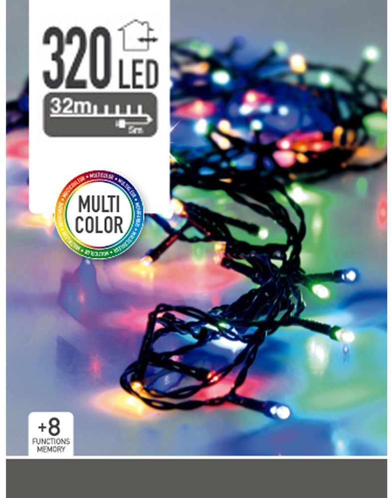 Lampki na choinkę 320 LED kolorowe lampki dekoracyjne Wielokolorowe lampki 320 LED to doskonały pomysł na stworzenie świątecznego klimatu. Lampki umocowane są na zielonym kablu w odstępach co 10cm. Specyfikacja techniczna: Ilość lampek: 320 Kolor lampek: kolorowe Odległość między lampkami: 10cm Długość kabla zasilającego: 5m Kolor kabla: zielony Wbudowany programator z 8 funkcjami świecenia