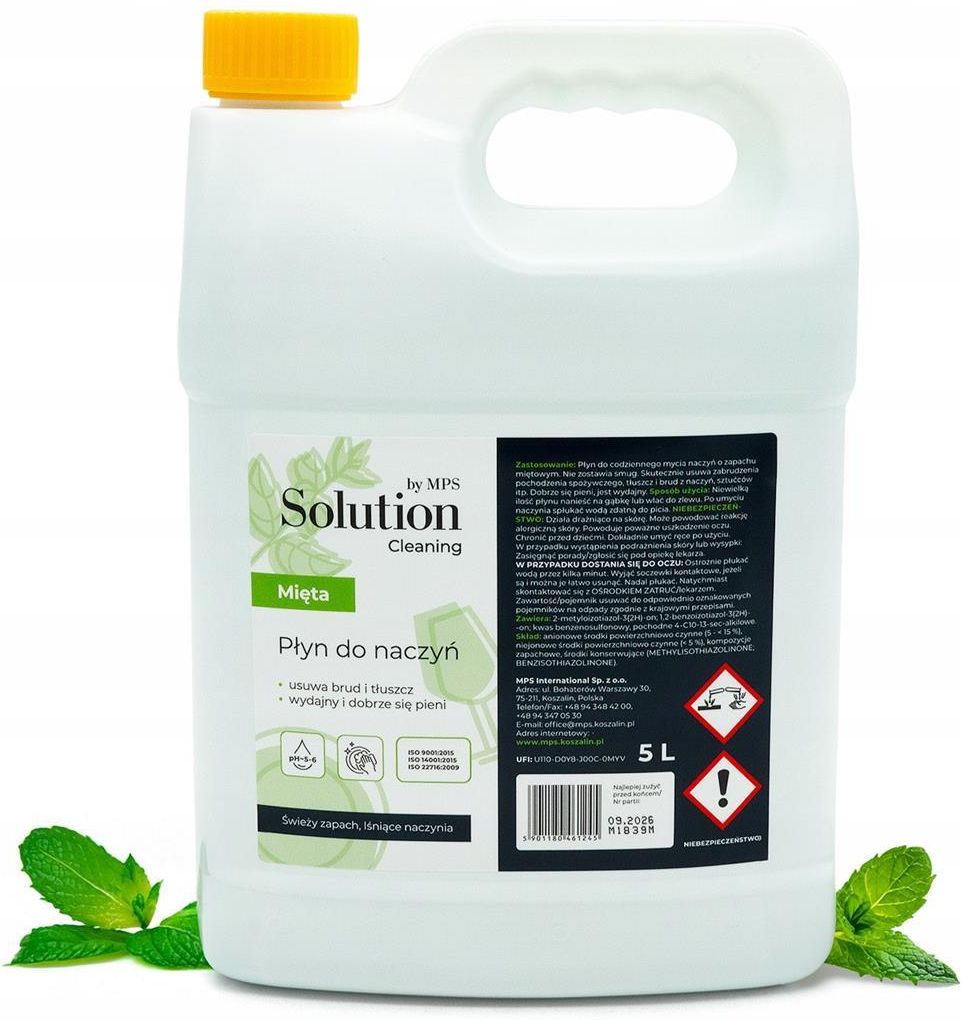 Płyn do mycia naczyń Solution by MPS - mięta 5l O produkcie Płyn do naczyń Solution by MPS - Cleaning z miętowym zapachem, który skutecznie usuwa tłuszcz i brud, jednocześnie dbając o Twoje dłonie. Opis produktu Świeży miętowy zapach, który odświeża podczas mycia. Skutecznie usuwa zabrudzenia pochodzenia spożywczego. Bezwzględny dla tłuszczu, nawet tego przypalonego. Świetnie radzi sobie z usuwaniem przebarwień po kawie i produktach owocowo-warzywnych. Doskonale myje naczynia oraz sztućce. Nabłyszcza i nie tworzy smug, pozostawiając naczynia krystalicznie lśniące. Wydajny – niewielka ilość płynu wystarcza do umycia dużej liczby naczyń. Płyn ma pH naturalne dla skóry, co czyni go łagodnym dla dłoni. Idealnie się pieni, przeznaczony do ręcznego mycia naczyń. Pojemność 5 l, gwarantuje długotrwałe użytkowanie. Pełny opis produktu: Przedstawiamy płyn do naczyń Solution by MPS - Cleaning z orzeźwiającym miętowym zapachem. Jest to wydajny płyn, który doskonale usuwa brud, tłuszcz i inne zabrudzenia pochodzenia spożywczego. Dzięki swojej formule jest bezwzględny dla tłuszczu, nawet tego przypalonego, a także skutecznie radzi sobie z usuwaniem przebarwień po kawie i produktach owocowo-warzywnych. Nie tylko doskonale myje naczynia i sztućce, ale także nabłyszcza je, nie pozostawiając smug. Szklane elementy po umyciu tym płynem stają się krystalicznie lśniące. Co więcej, niewielka ilość płynu pozwala na umycie dużej liczby naczyń, co czyni go wyjątkowo wydajnym. Płyn Solution by MPS - Cleaning jest przeznaczony do ręcznego mycia naczyń i idealnie się pieni. Dodatkowo, dzięki pH naturalnemu dla skóry, jest łagodny dla dłoni, dbając o ich kondycję podczas codziennych prac domowych. Wybierz jakość i skuteczność w jednym – wybierz płyn do naczyń Solution by MPS - Cleaning. Parametry produktu Skuteczność: Bezwzględne dla tłuszczu, nawet tego przypalonego Zapach: Świeży miętowy zapach, który odświeża podczas mycia Zastosowanie: Do mycia naczyń, skutecznie usuwa zabrudzenia pochodzenia spożywczego Pojemność: 5 l Wydajność: Pojemność 5l, gwarantuje długotrwałe użytkowanie