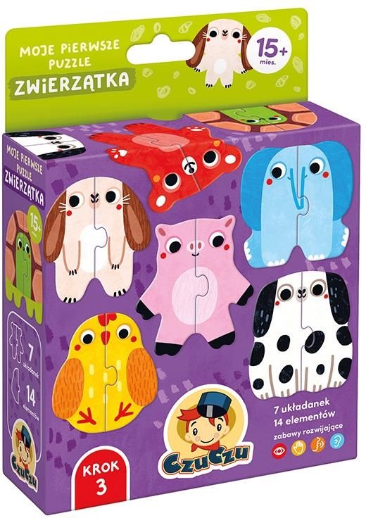 CzuCzu Moje pierwsze puzzle Zwierzątka dla dzieci 15 mies.+ Czu czu Baby Hej, maluszki, czas na układanie pierwszych puzzli! Urocze zwierzątka zapraszają początkujących układaczy do wszechstronnie rozwijającej zabawy. Wyszukiwanie i łączenie symetrycznych połówek to świetny pomysł na rozwijanie spostrzegawczości i sprawności dłoni. Nazywanie zwierzątek to sposób na budowanie zasobu słownictwa i wiedzy o świece. Wesoła zabawa rozwija kreatywność. zestaw zawiera: 7 dwuelementowych układanek elementy są wykonane z grubej, trwałej tektury pudełko o wymiarach 14,5 x 20 x 5 cm odpowiednie dla dzieci w wieku 15 mies.+ doskonały pomysł na pierwsze puzzle zabawa rozwija mała motorykę, spostrzegawczość i wyobraźnię Przepis na dobrą zabawę Moje pierwsze puzzle Zwierzątka sprawdzą się jako edukacyjny prezent dla najmłodszych odkrywców i pierwsze układanki. Zabawa polega na wyszukiwaniu i łączeniu symetrycznych dwuelementowych puzzli. Każde dopasowanie to powód do radości! Ułóżcie puzzle: to zabawa, która doskonali spostrzegawczość, wyobraźnię przestrzenną i oczywiście sprawność dłoni. Nazywajcie zwierzątka, ich kolory, detale na ilustracjach. Wymyślajcie o nich historyjki. Naśladujcie ich odgłosy i ruchy. Radość odkrywania W drugim roku życia dzieci chłoną nową wiedzę i coraz lepiej rozumieją otaczający go świat. Uwielbiają wspólne spędzanie czasu, bacznie obserwują otoczenie i uczą się, naśladując dorosłych. Dobrze się składa, bo układanie puzzli to wyjątkowo przyjemny sposób na wartościowe spędzanie czasu razem! Pozwala rozwijać małą motorykę, bystre oko i wyobraźnię. To sposób, aby na wesoło zdobywać i utrwalać wiedzę o tym, co dzieci znają i lubią, i kształtować zdrowe nawyki. CzuCzu jest polską marką, którą tworzymy od 2009 r. Książeczki, gry, puzzle i zabawki edukacyjne opieramy na prostych rozwiązaniach, które dają rodzicom i dzieciom przestrzeń do inicjowania własnych pomysłów na zabawę. Podążamy za dziećmi, wspierając ich rozwój motoryczny, emocjonalny i społeczny. Nasze książeczki i zabawki odznaczają się najwyższą jakością wykonania i są dopracowane w najmniejszym szczególe. CzuCzu jest w całości produkowane w Polsce. Wiemy też, że dobra zabawa nie ma górnej granicy wieku! Rośniemy razem z dziećmi, słuchamy naszych klientów i… nas samych, bo w Zespole CzuCzu jest mnóstwo puzzlomaniaków. Stąd pomysł na nową serię Puzzlove CzuCzu, w której znajdziecie duże układanki o zróżnicowanej liczbie elementów. To świetny pomysł na relaks i zabawę dla dzieci, młodzieży i dorosłych. Wiemy, czym jest radość układania. Doceniają nas nie tylko dzieci i rodzice! Z dumą i radością dajemy znać, że w 2020 roku za całokształt naszych działań edukacyjnych dostaliśmy Nagrodę Specjalną w XVIII edycji Konkursu Świat Przyjazny Dziecku organizowanego przez Komitet Ochrony Praw Dziecka.
