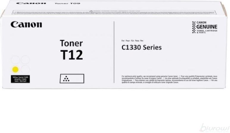 Canon T-12 żółty Oryginalny wkład do drukarki laserowej. Korzystanie z wkładu oryginalnego, zapewnia wyraźny i precyzyjny wydruk. Dzięki zastosowaniu najwyższej kontroli jakości, toner zapewnia bezawaryjną pracę w całym okresie jego użytkowania. Toner oryginalny.  Wydajność 5300 stron Zgodność: Canon i-SENSYS X C1333P Canon i-SENSYS X C1333i Canon i-SENSYS X C1333iF