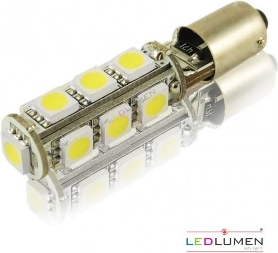 Ilość i typ LED: 13 szt. diod SMD 5050 high brightness Typ / Rodzaj trzonka: T4W/BA9s Napięcie zasilania: 10,8-13,8V Barwa światła: biała zimna (xenon look) Kąt świecenia: 360 stopni Trwałość: 50 000 godzin Efektywność energetyczna: A Certyfikaty: CE, RoHS Wysokość: 48mm Szerokość: 11,5mm Żarówka …