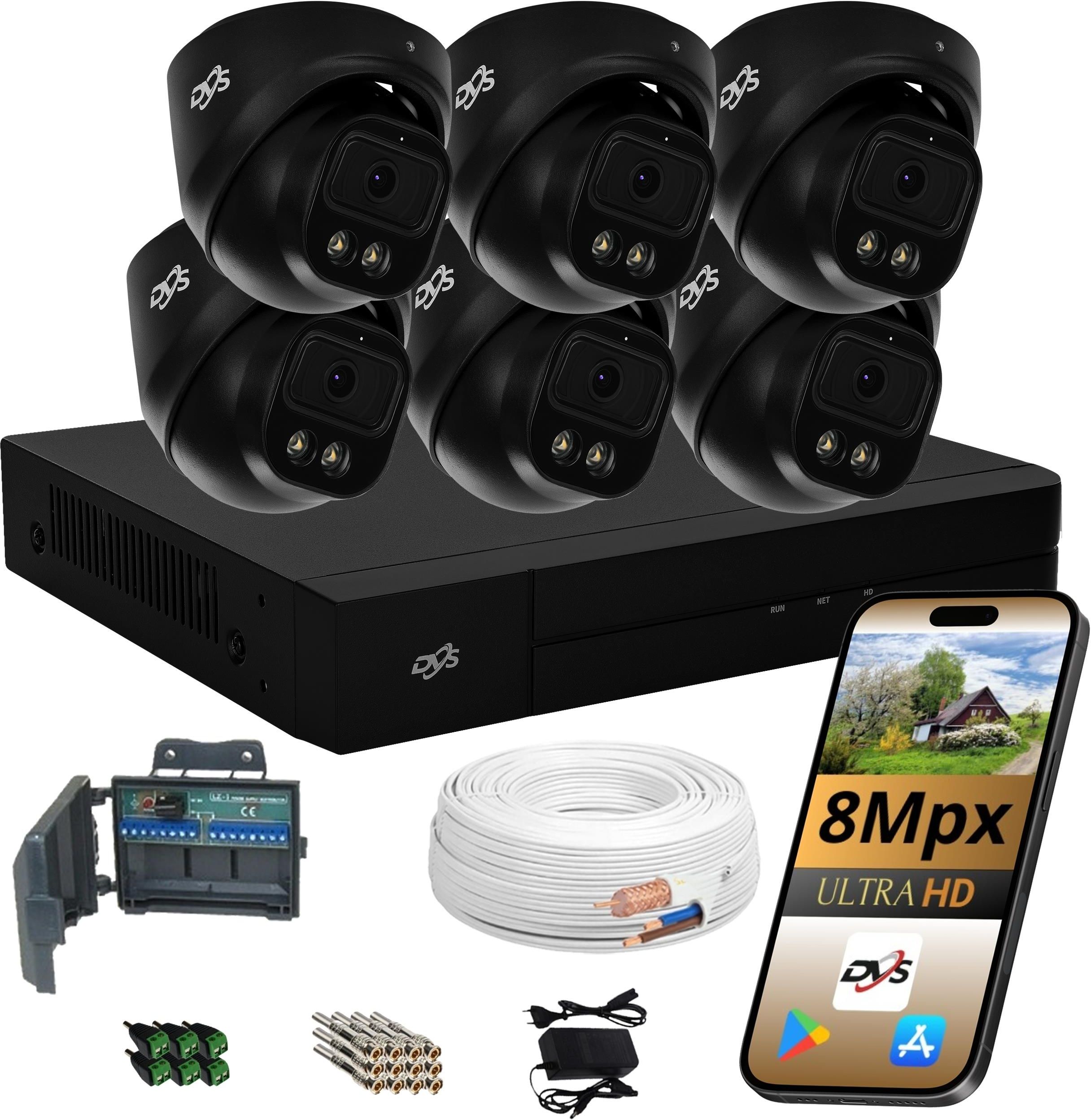 • ZESTAW 6 ZEWNĘTRZNYCH KAMER DVS CZARNA KOPUŁKA 8MP