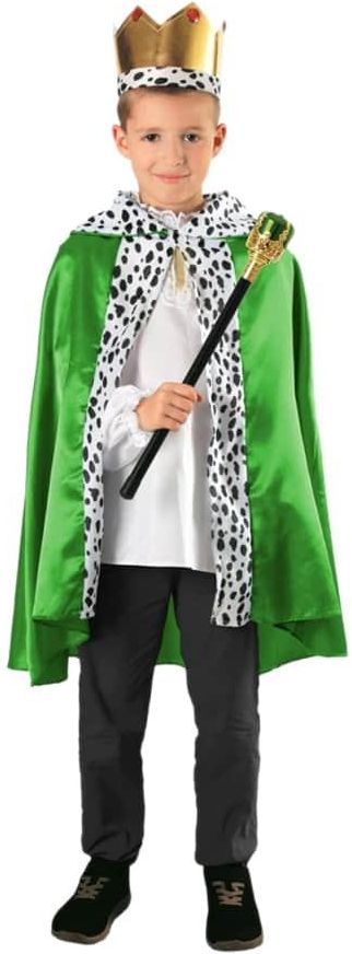 KOD PRODUKTU: #P5750^a STRÓJ KRÓL W skład stroju królewskiego wchodzą: - zielona peleryna - złota korona - biała bluzka - czarne spodnie na gumce Kod produktu: #P5750^a Okazja: Jasełka Temat: Król SKŁAD ZESTAWU: 1. SPODNIE DŁUGIE POLIESTER CZARNE 98-110 Rozmiar / Wzrost: S 98-110 cm Wiek: 3-5 lat Skład kompletu: 1. spodnie Materiał: poliester Obwód w pasie [A]: 40-70 cm (wszyta gumka) Długość całkowita [B]: 66 cm Długość nogawki od kroku [C]: 46 cm Szerokość nogawki [D]: 19 cm 2. BLUZKA CHŁOPIEC POLIESTER BIAŁA 98-110 Rozmiar / Wzrost: S 98-110 cm Wiek: 3-5 lat Materiał: poliester Długość całkowita [C]: 46 cm Szerokość w klatce piersiowej [B]: 40 cm Uwagi: regulowany dekolt 3. KORONA KRÓLA ZŁOTA Rozmiar: uniwersalny Kolor: złoty Wysokość: 11 cm Obwód: 44-55 cm 4. STRÓJ PELERYNA KRÓLEWSKA ZIELONA 68cm Rozmiar / Wzrost: Uniwersalny Wysokość całkowita [A]: 68 cm (bez kołnierza) Szerokość całkowita na dole [B]: 140 cm Pomiar: Tolerancja błędu +/- 2cm