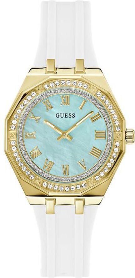 Guess GW0872L1 Desire Damski zegarek Guess GW0872L1 Desire to doskonały przykład połączenia elegancji z nowoczesnością. Zegarki od lat pełnią nie tylko funkcję narzędzi do pomiaru czasu, ale również stanowią istotny element stylizacji, który pozwala wyróżnić się w tłumie. Ten model idealnie podkreśli osobisty styl oraz charakter jego właścicielki, czyniąc go idealnym dodatkiem na różne okazje. Rodzaj i mechanizm zegarka Prezentowany model to elegancki zegarek analogowy, przeznaczony dla kobiet, co czyni go idealnym wyborem do codziennego użytku oraz na specjalne okazje. Mechanizm kwarcowy, który napędza to piękne akcesorium, zapewnia precyzyjne działanie oraz niską potrzebę konserwacji. Dzięki tym właściwościom, ten damski zegarek charakteryzuje się niezawodnością, co sprawia, że jego użytkowanie jest komfortowe i bezproblemowe. Materiał i wymiary koperty Koperta zegarka została stworzona ze stali nierdzewnej w eleganckim złotym kolorze, co dodaje mu luksusowego wyglądu. Średnica 36 mm oraz grubość 8 mm sprawiają, że model jest wygodny w noszeniu oraz dobrze prezentuje się na nadgarstku. Dzięki przemyślanej wielkości, ten zegarek idealnie pasuje do różnych sylwetek, czyniąc go uniwersalnym wyborem zarówno na co dzień, jak i na wyjątkowe okazje. Szkiełko W tym modelu zastosowano szkiełko mineralne, które charakteryzuje się wysoką przejrzystością oraz odpornością na zarysowania. Dzięki tym właściwościom, użytkowniczki mogą cieszyć się niezmiennie eleganckim wyglądem tarczy przez długi czas. To istotny atut, który sprawia, że zegarek nie tylko wygląda świetnie, ale jest również praktyczny. Bransoleta i pasek Pasek wykonany z wysokiej jakości silikonu w białym kolorze doskonale współgra z elegancką, złotą kopertą. Jego długość 19 cm oraz szerokość 18 mm zapewniają komfort noszenia, a klamra stabilizuje zegarek na nadgarstku. Silikon to materiał odporny na działanie wody, co czyni ten model doskonałym wyborem dla aktywnych kobiet, które pragną łączyć elegancję z funkcjonalnością. Wodoszczelność Zegarek charakteryzuje się wodoszczelnością na poziomie 50 metrów (5 ATM), co oznacza, że ten model jest odporny na zachlapania oraz krótki kontakt z wodą. To ważny atut dla osób, które prowadzą aktywny tryb życia, a jednocześnie pragną cieszyć się eleganckim akcesorium. Funkcje dodatkowe Mimo że model ten nie jest wyposażony w podświetlenie, jego klasyczny design i eleganckie wykończenie przyciągają wzrok. Oto niektóre z kluczowych funkcji, które wyróżniają ten zegarek: Rodzaj: analogowy, Mechanizm: kwarcowy, Kolor koperty: złoty, Kolor tarczy: niebieski, Kolor paska: biały, Materiał koperty: stal nierdzewna, Wodoszczelność: 50 m (5 ATM). Styl i design Styl klasyczny, w jakim został zaprojektowany zegarek, sprawia, że idealnie wpisuje się w różnorodne okazje. Ten model doskonale komponuje się zarówno z formalnymi strojami, jak i codziennymi outfitami. Złoto i biel to elegancka paleta kolorów, która sprawdzi się w wielu stylizacjach. Można go nosić do eleganckiej sukienki na wieczorne wyjście, jak i do dżinsów i t-shirta na co dzień. Warto również zestawić go z biżuterią w podobnych odcieniach, co dodatkowo podkreśli jego urok.