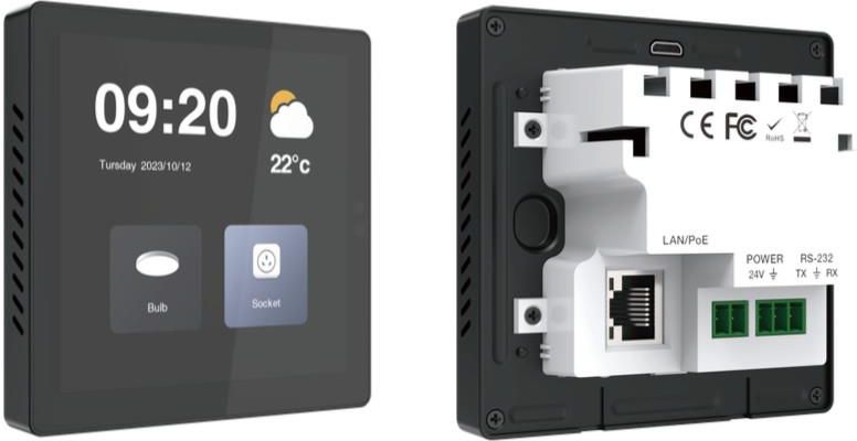 Ścienny programowalny dotykowy panel sterujący 4-calowy 480×480 (1:1). Sterowanie: RS-232, LAN. Zasilanie: PoE lub DC 12V. Posiada wbudowany interfejs www. Ochrona hasłem przed nieautoryzowanym dostępem. HDH-TSWP04C - programowalny dotykowy panel sterujący HDH-TSWP04C - programowalny panel sterowania, przeznaczony do wykorzystania w sektorach zautomatyzowanego systemu biurowego, pomieszczeń multimedialnych i inteligentnego domu. Dzięki programowalnemu interaktywnemu interfejsowi użytkownika ponad protokołami konfiguracji, zintegrowany system zapewnia inteligentną usługę sieciową. Panel dotykowy do montażu na ścianie, o standardowej obudowie 86, wyposażony jest w pojemnościowy ekran dotykowy o rozdzielczości 480×480 pikseli i obsługuje jeden port LAN oraz jeden port szeregowy RS-232. Jest używany w różnych instalacjach i aplikacjach w różnych branżach, w tym w multimedialnych salach konferencyjnych, wielofunkcyjnych halach, centrach szkoleniowych, salonach wystawowych, studiach nadawczych i automatyce przemysłowej. Cechy: ☆ Układ ARM Cortex-A55 z podstawowym taktowaniem 1,8 GHz☆ System Android 11, 4GB RAM, 32GB eMMC☆ 4-calowy wyświetlacz 480×480 (1:1) z pojemnościowym ekranem dotykowym w standardowym rozmiarze 86☆ Jedno urządzenie z dwoma trybami pracy, może służyć jako centralne sterowanie z ekranem dotykowym lub jako terminal użytkownika☆ Obsługa jednego portu komunikacji szeregowej RS-232, który umożliwia konfigurację 8 prędkości transmisji w zakresie 2400–115200 b/s☆ Dostępu do strony internetowej zarządzania systemem z ochroną hasłem przed nieautoryzowanym dostępem☆ Projektowanie i programowanie interfejsów za pomocą narzędzi projektowych IDE☆ Zgodność ze standardowymi protokołami komunikacji sieciowej (TCP/IP, HTTP, UDP, WebSocket)☆ Gigabajtowy port sieciowy☆ Podwójny tryb zasilania — obsługuje PoE lub zasilanie prądem stałym☆ Obsługa przywracania ustawień fabrycznych Zobacz inne panele sterujące;
