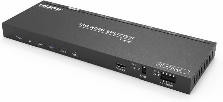 Rozdzielacz HDV-B14SA 1x4 HDMI przesyła jedno źródło HDMI na cztery wyjścia HDMI jedocześnie. Jest w pełni kompatybilny z sygnałami 3D i rozdzielczościami do 4k2k w 60Hz z 4:4:4. Oferuje rozwiązania do supermarketów, centrów handlowych, HDTV, STB, DVD oraz projektorów, centrów kontroli i dystrybucji informacji, sal konferencyjnych, szkoleń i edukacji, firmowych sal pokazowych, luksusowych domów i wielu innych. Pozwala na skalowanie niezależne wyjść. Przy sygnale wejściowym 4K możemy dowolnie skalować wyjścia np. oba na 1080p, lub niezależnie jedno 4K drugie 1080p. Ponadto HDV-B14SA pozwala na wyodrębnienie sygnału audio z HDMI: optycznego i analogowego (posiada wyjścia: L/R audio - 3.5mm Stereo Mini-jack oraz optyczne - S/PDIF). Cechy: • HDMI 2.0a, HDCP 2.2 • Wspiera rozdzielczości do 4K2K@60Hz z 24bit RGB/YCBCR 4:4:4/YCBCR 4:2:2 • Wspiera 3D z rozdzielczościami do 4K2K@30Hz • Wspiera audio LPCM 7.1CH, Dolby TrueHD, orazDTS-HD Master Audio • Wspiera EDID: Auto lub Copy z 1 wyjścia nr. 1 • Mały i prosty w instalacji • Nie przesyła sygnału HDR • Niezależne skalowanie wyjść z 4K do 1080p • Wyjścia audio optyczne oraz analogowe 3.5mm